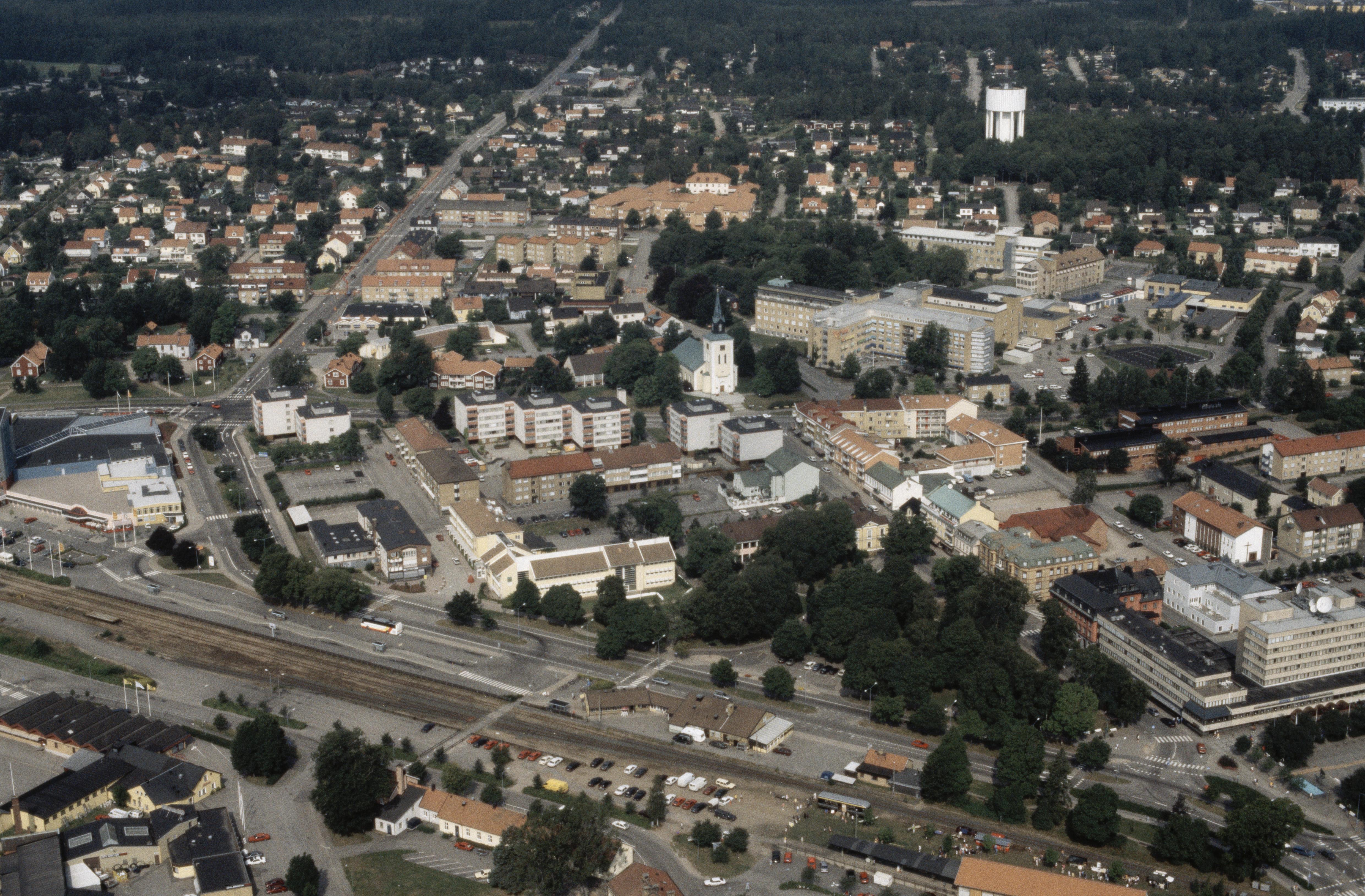 Beskrivning: Ljungby stad. Ljungby kyrka vid bildens mitt. Bilden är tagen mot (väderstreck): VNV