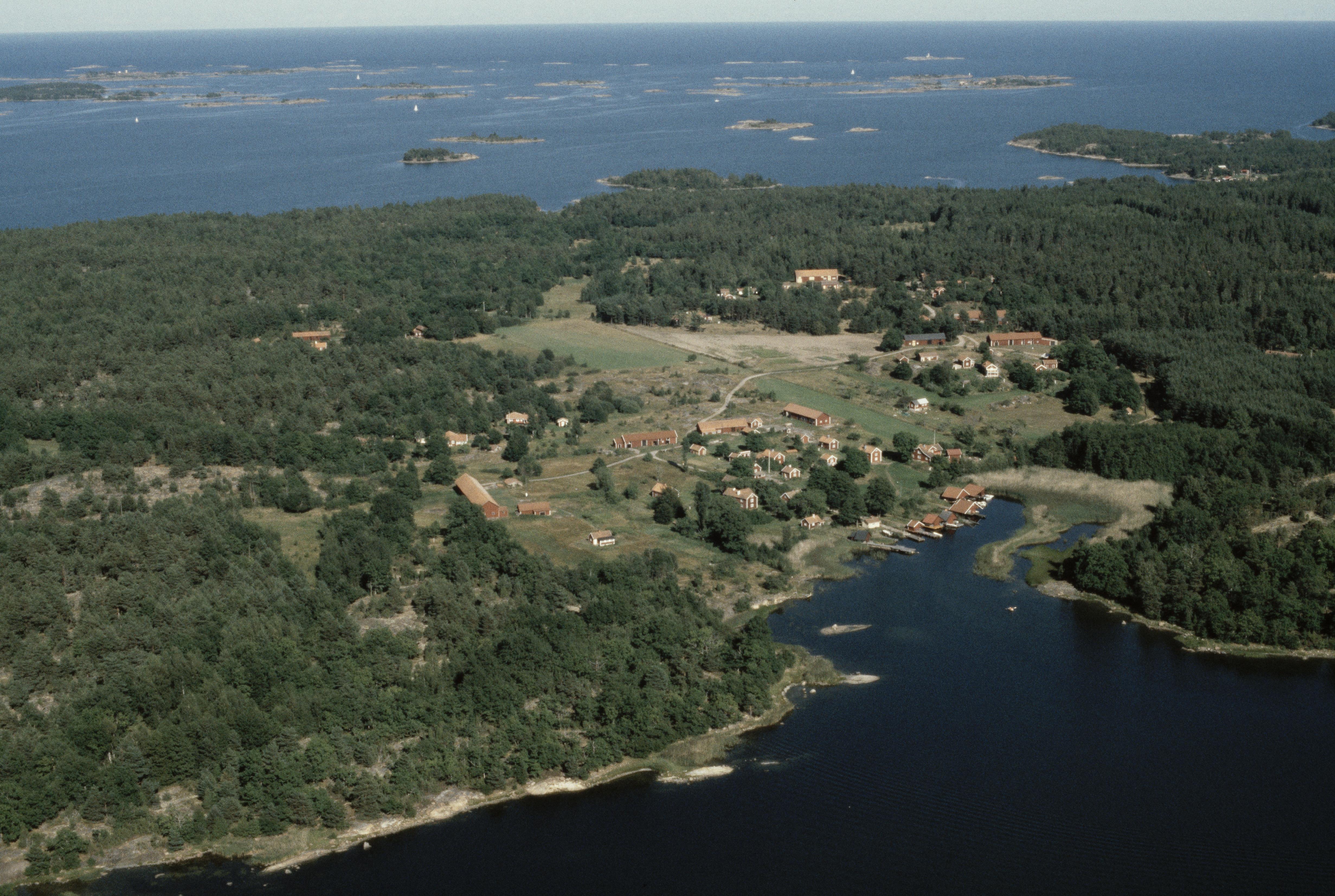 Beskrivning: Hasselö i Tjusts skärgård. Hasselö by vid bildens mitt. Bilden är tagen mot (väderstreck): NO