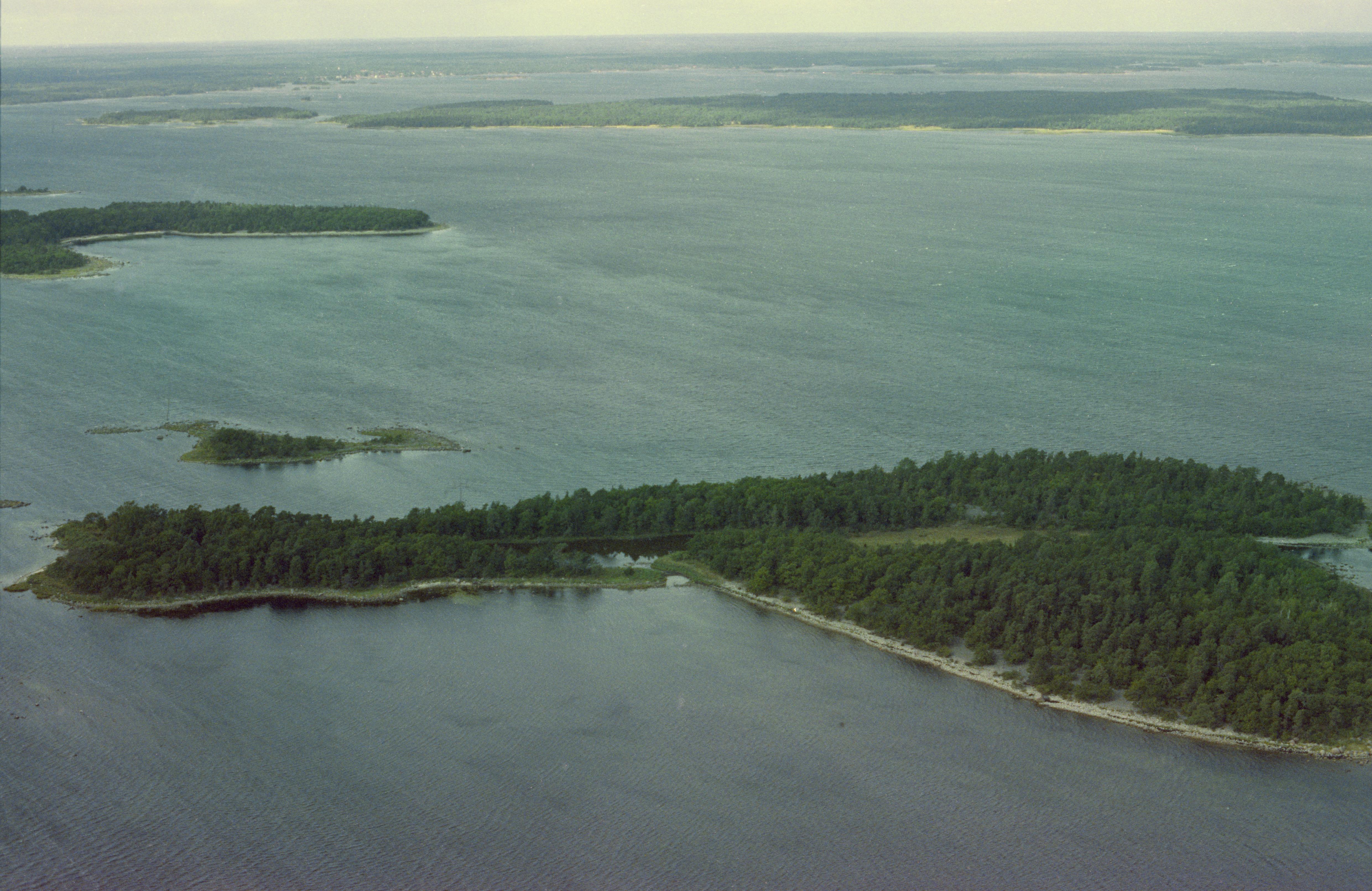 Beskrivning: Taktö i Vållö naturreservat. På ön finns flera fornlämningar, bl.a. fiskeläge RAÄnr Mönsterås 340:1. Sandö uppe till vänster. Bilden är tagen mot (väderstreck): VNV