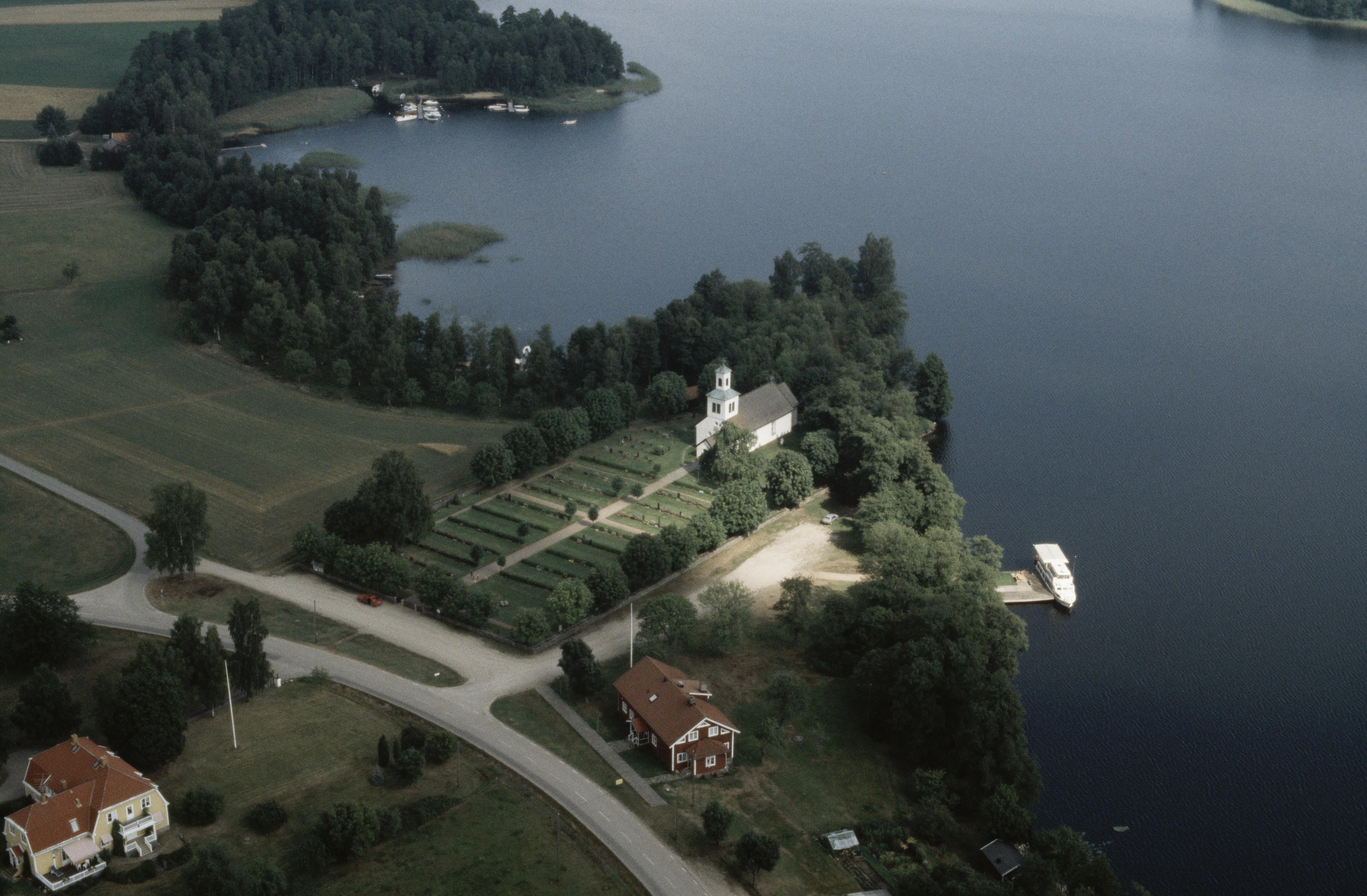Beskrivning: Odensjö kyrka vid Kyrviken i sjön Bolmen. Bilden är tagen mot (väderstreck): NO