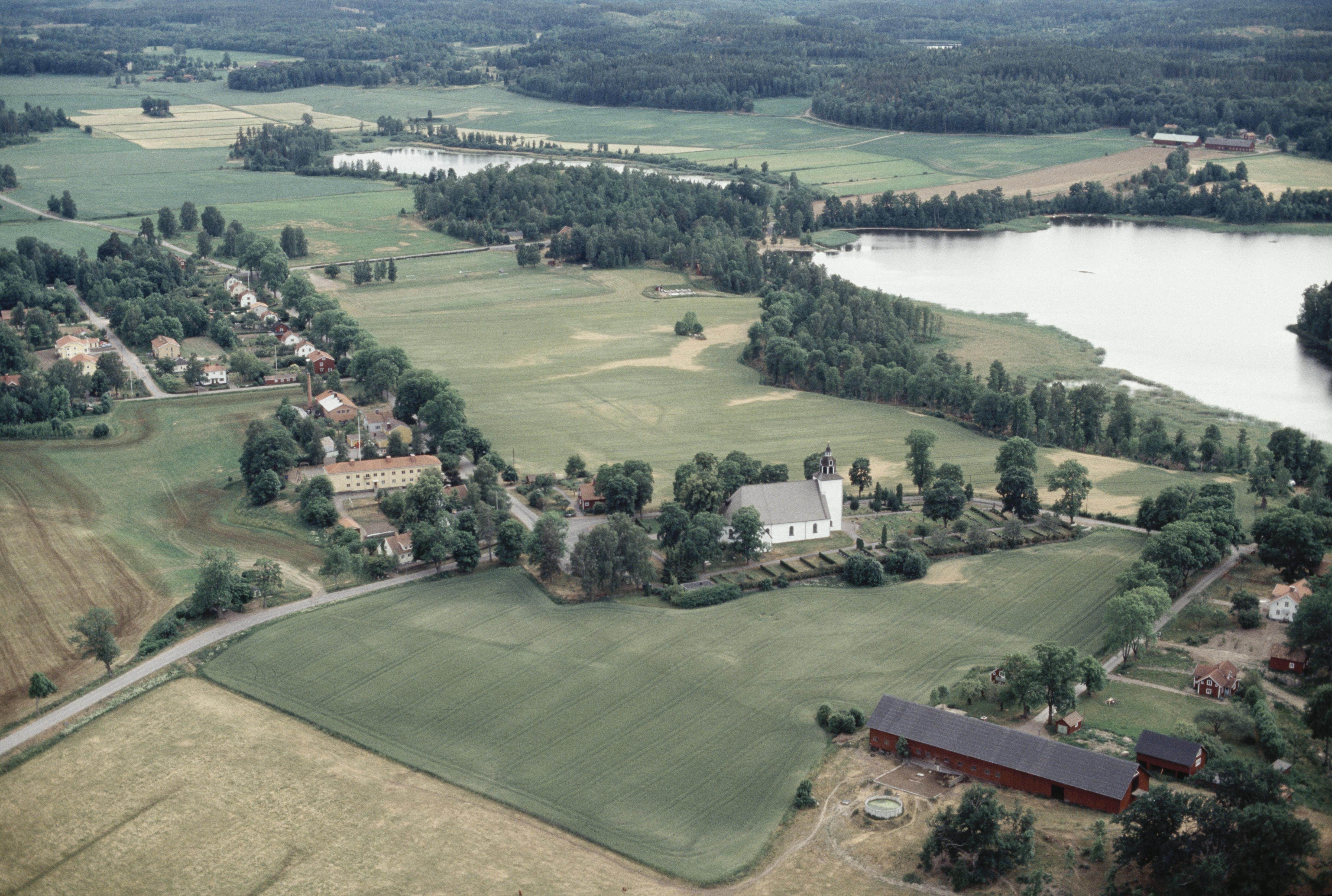 Beskrivning: Odensvi kyrka och kyrkby vid Kyrksjön. Bilden är tagen mot (väderstreck): SSV