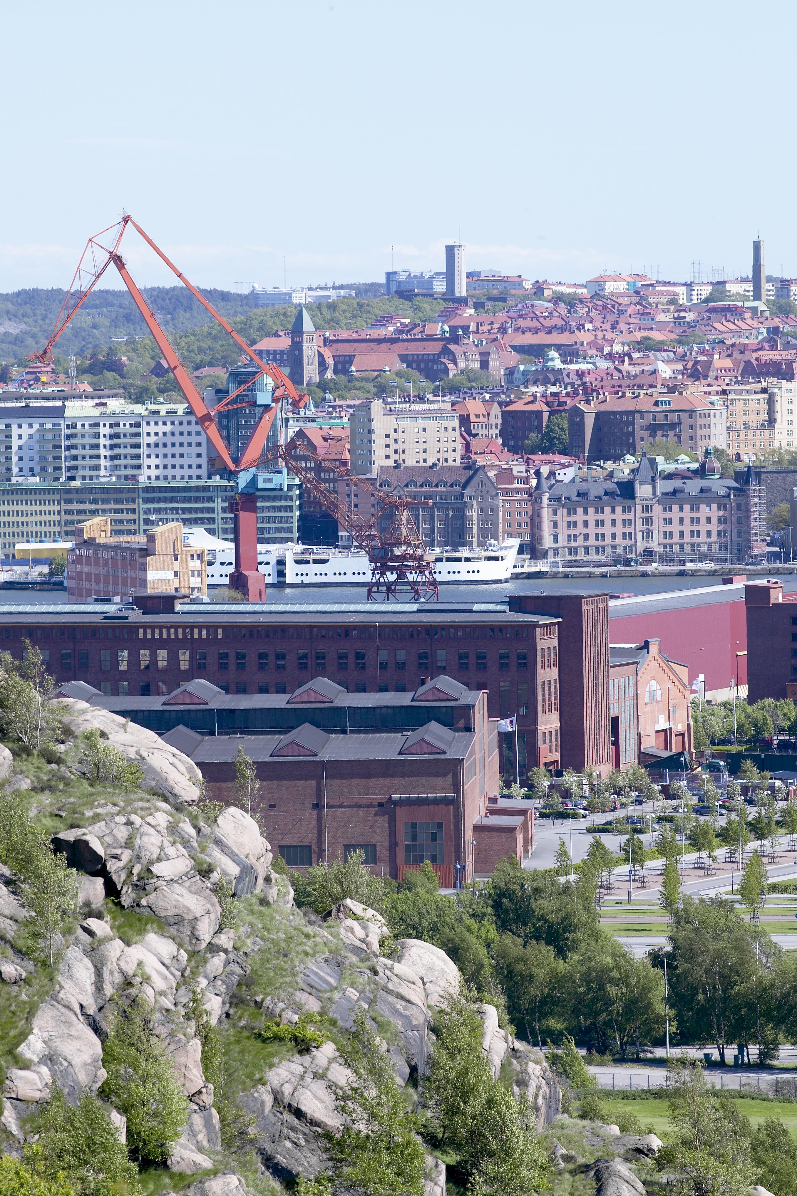 Beskrivning: Vy mot söder från Ramberget, Götaverkens fd varvsområde.
