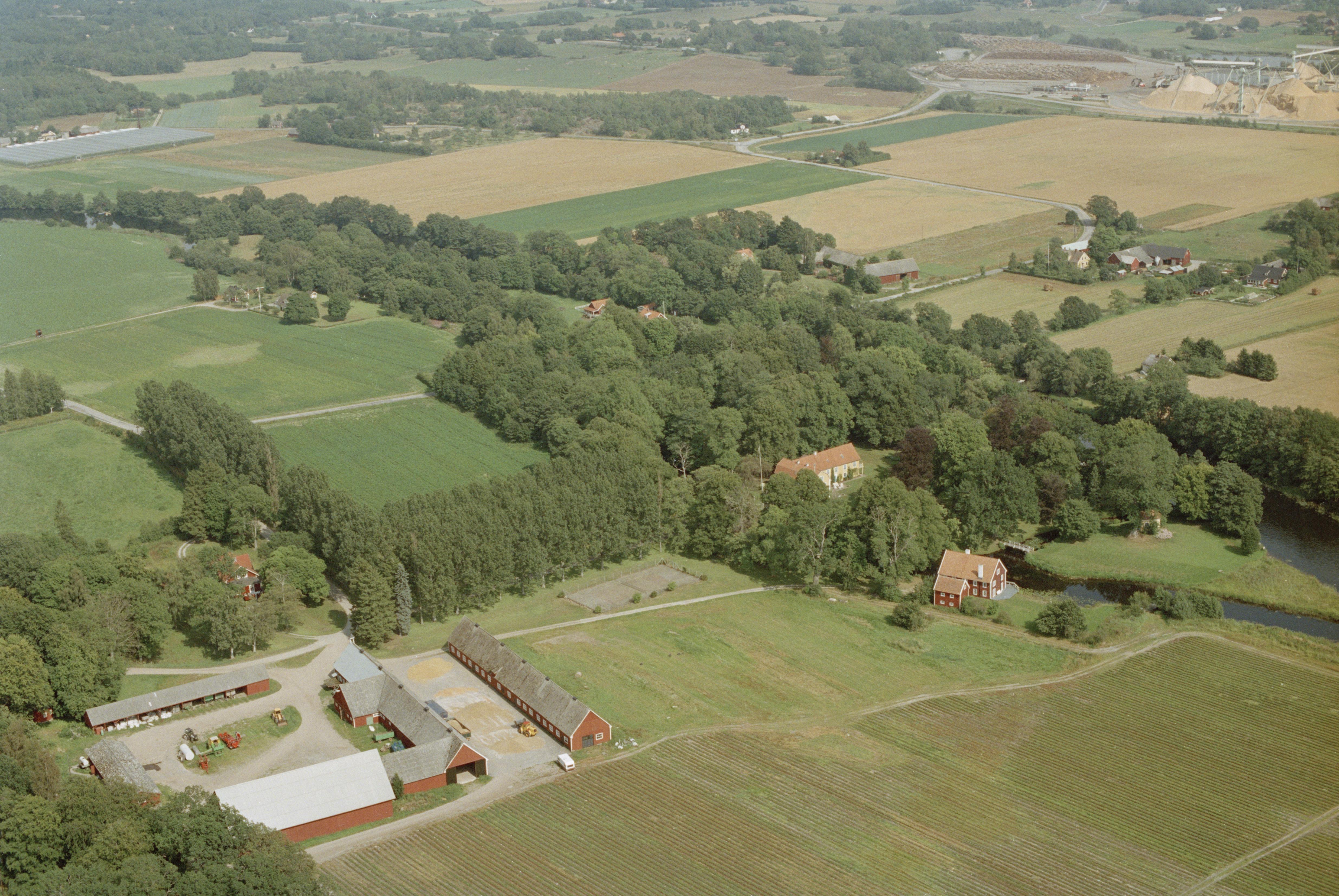 Beskrivning: Mörrumsån vid Elleholms hovgård / herrgård och Elleholms kyrka (skymd bland träden). Fornlämningsområde med bl.a. stadslager RAÄnr Elleholm 12:1. Bilden är tagen mot (väderstreck): NO