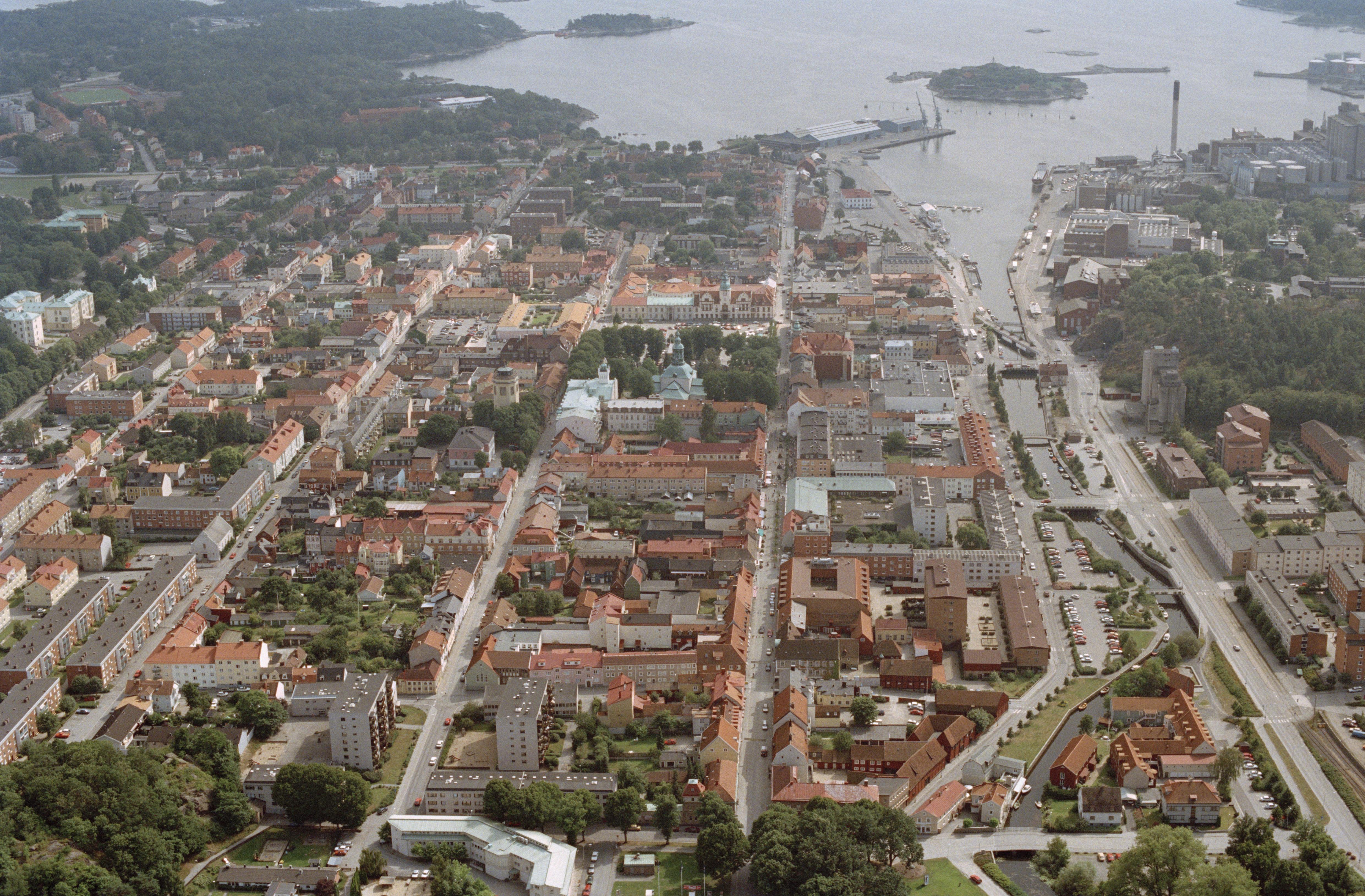 Beskrivning: Karlshamns stad. Carl Gustafs kyrka vid bildens mitt. I bildens övre del Kastellet RAÄnr Karlshamn 6:1. Bilden är tagen mot (väderstreck): SSO
