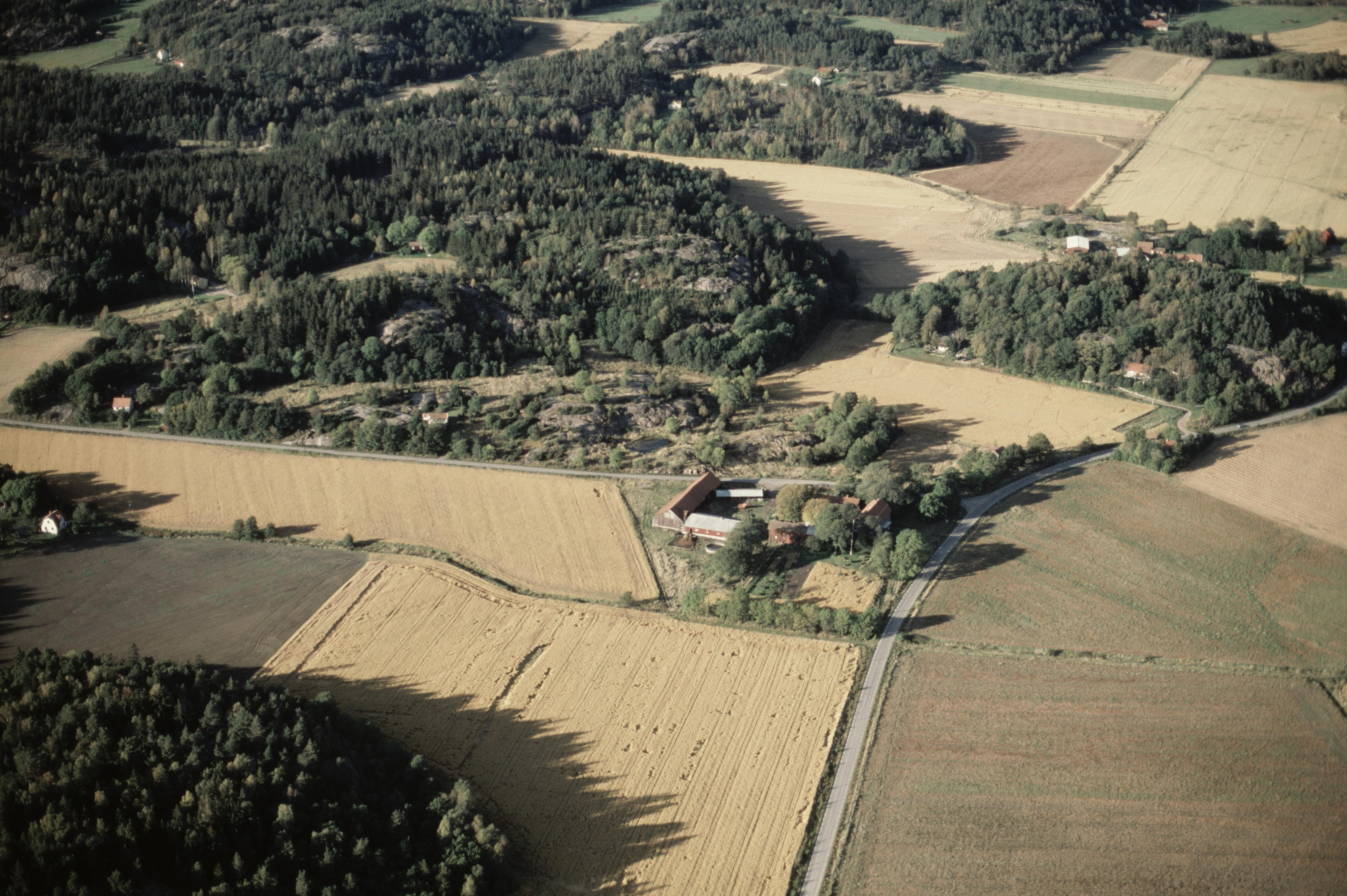 Beskrivning: Broälvens dalgång vid Vese hergård / säteri. Fornlämningar, bl.a. hällristningar RAÄnr Bro 26:1-3, m.fl. vid bildens mitt. Bilden är tagen mot (väderstreck): N