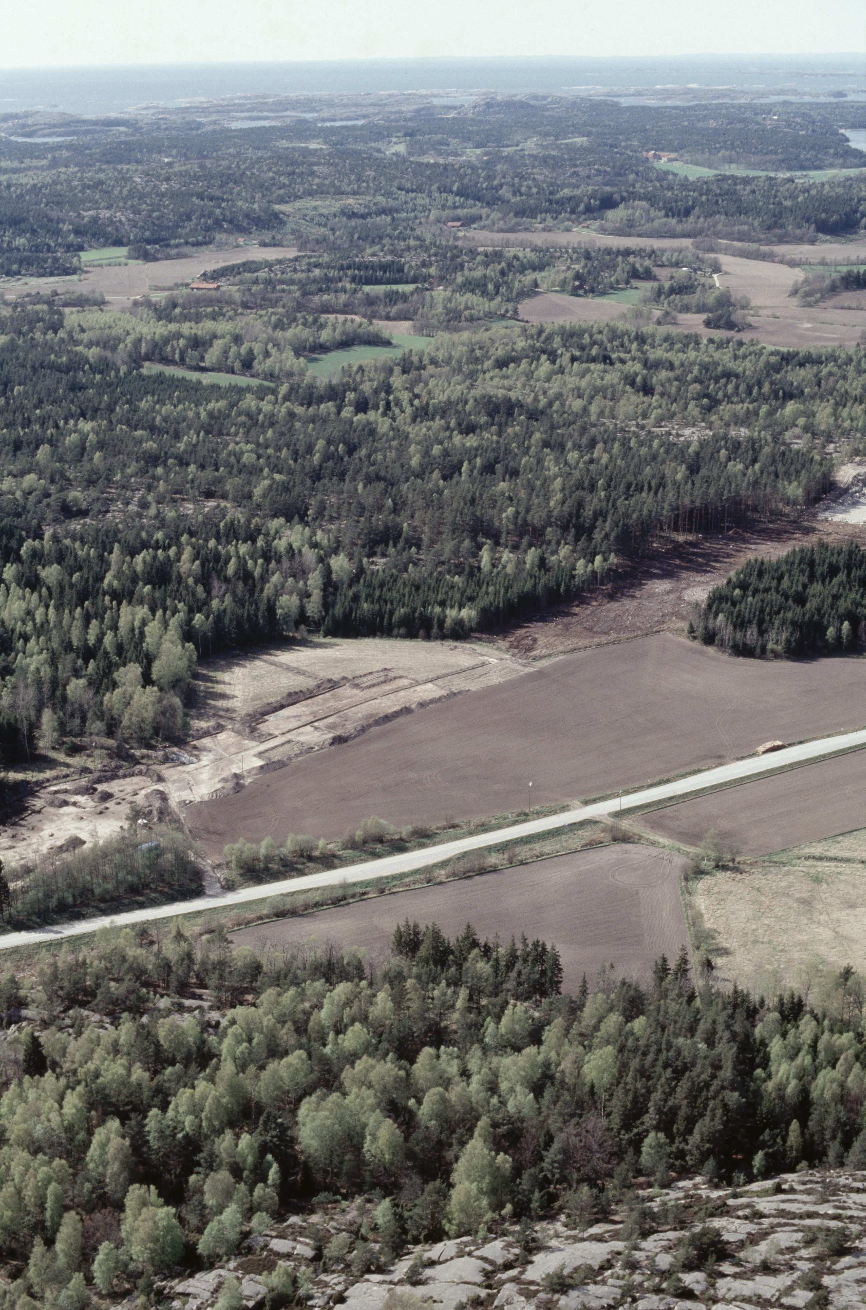 Beskrivning: Klockaregården i Tanum. Område med arkeologiska undersökningar i samband med vägbygge (väg E6). Boplatsutgrävning RAÄnr Tanum 539:1. Bilden är tagen mot (väderstreck): VNV