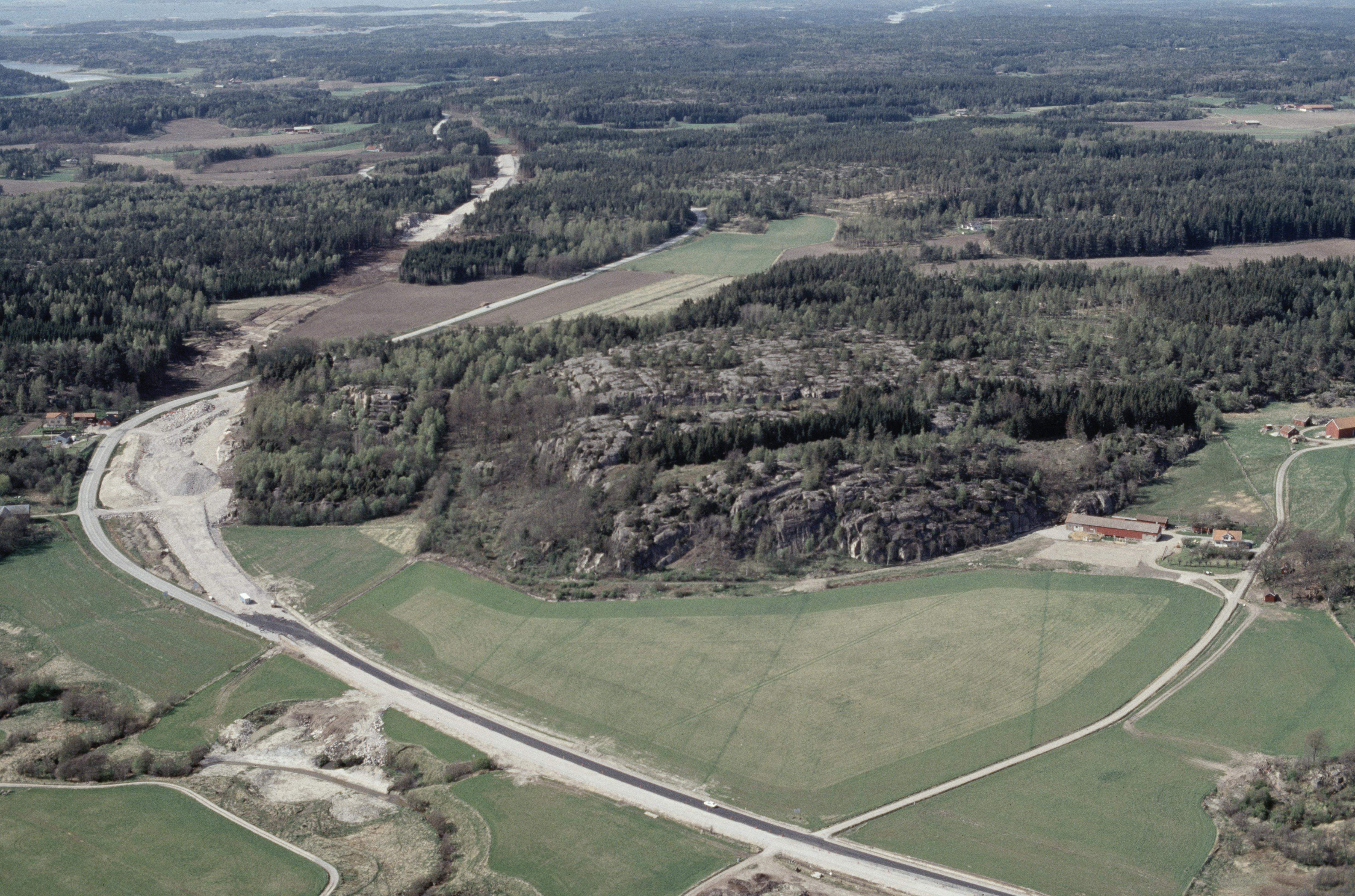 Beskrivning: Område med arkeologiska undersökningar i samband med vägbygge (väg E6). Rörängen och boplats RAÄnr Tanum 1831:1 under bildens mitt. I bildens övre del Präste-Säm. Bilden är tagen mot (väderstreck): NV