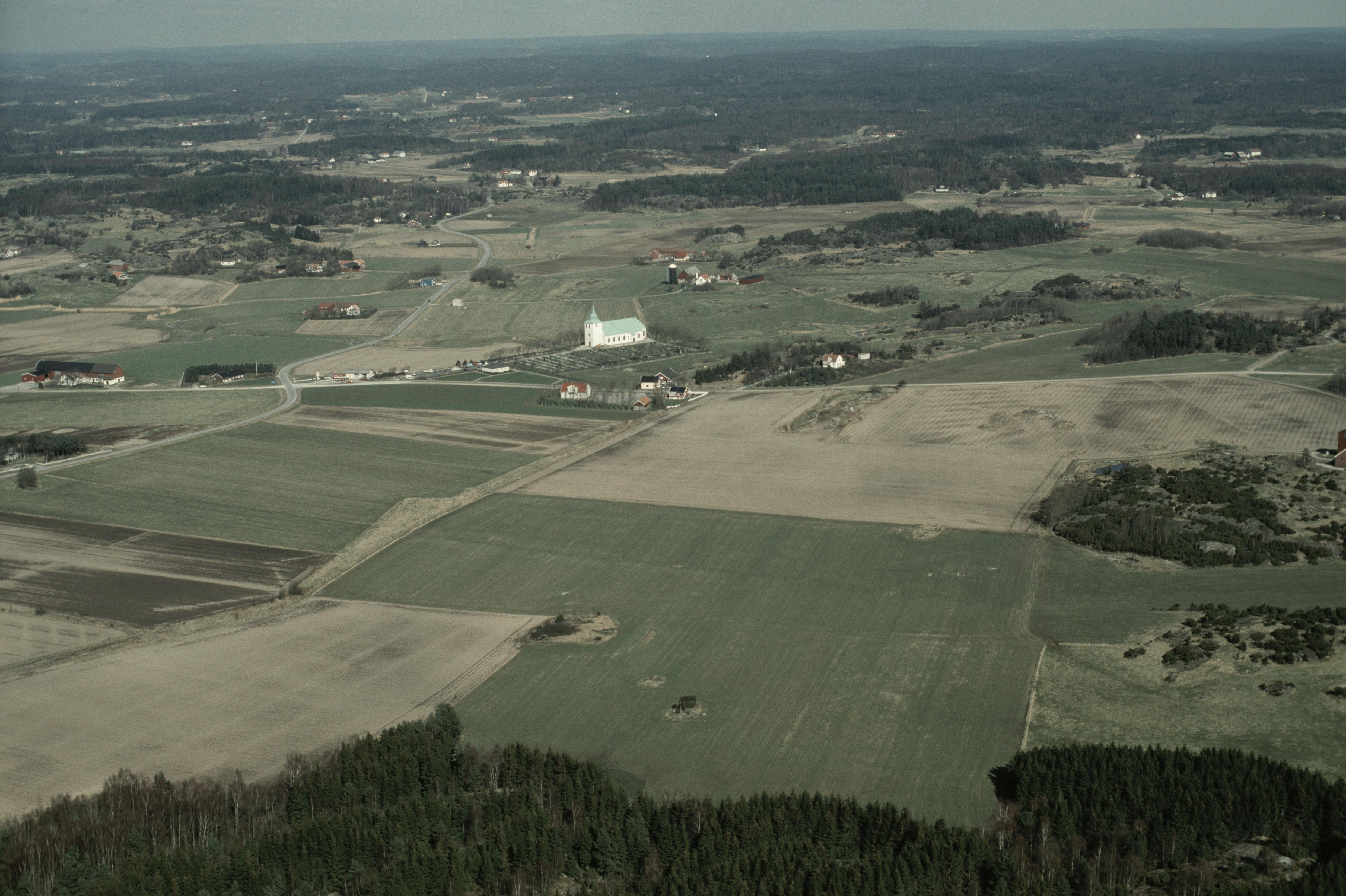 Beskrivning: Tegneby kyrka vid bildens mitt. Bilden är tagen mot (väderstreck): N