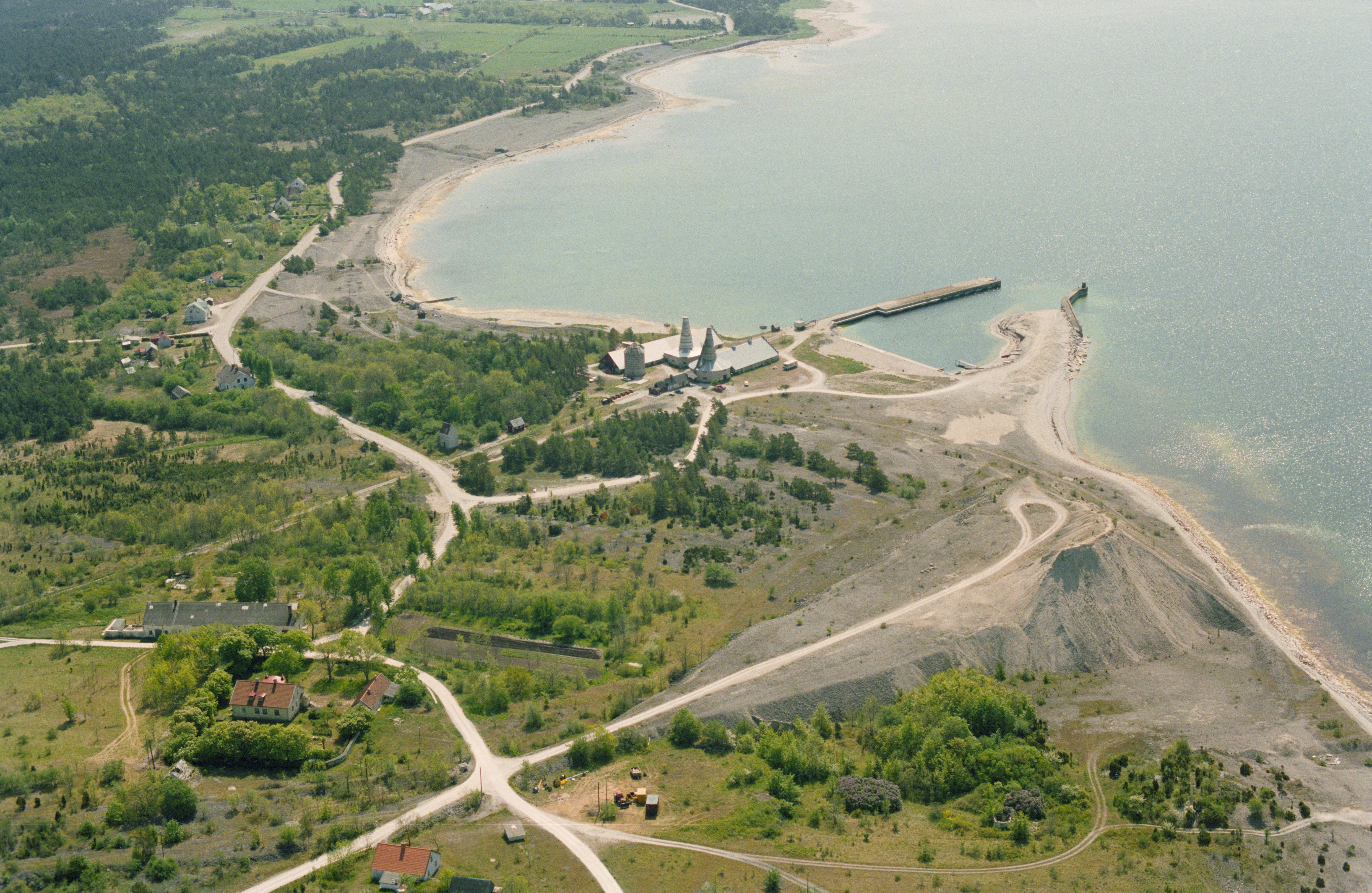Beskrivning: Vid bildens mitt kalkugnar vid hamnen i Bläse fiskeläge och industriort vid Kappelshamnsviken. I området lämningar efter kalstensindustri; arbetarbostäder, järnväg, hamn RAÄnr Fleringe 94:6, stenbrott, kalkugnar, m.fl. Bilden är tagen mot (väderstreck): S