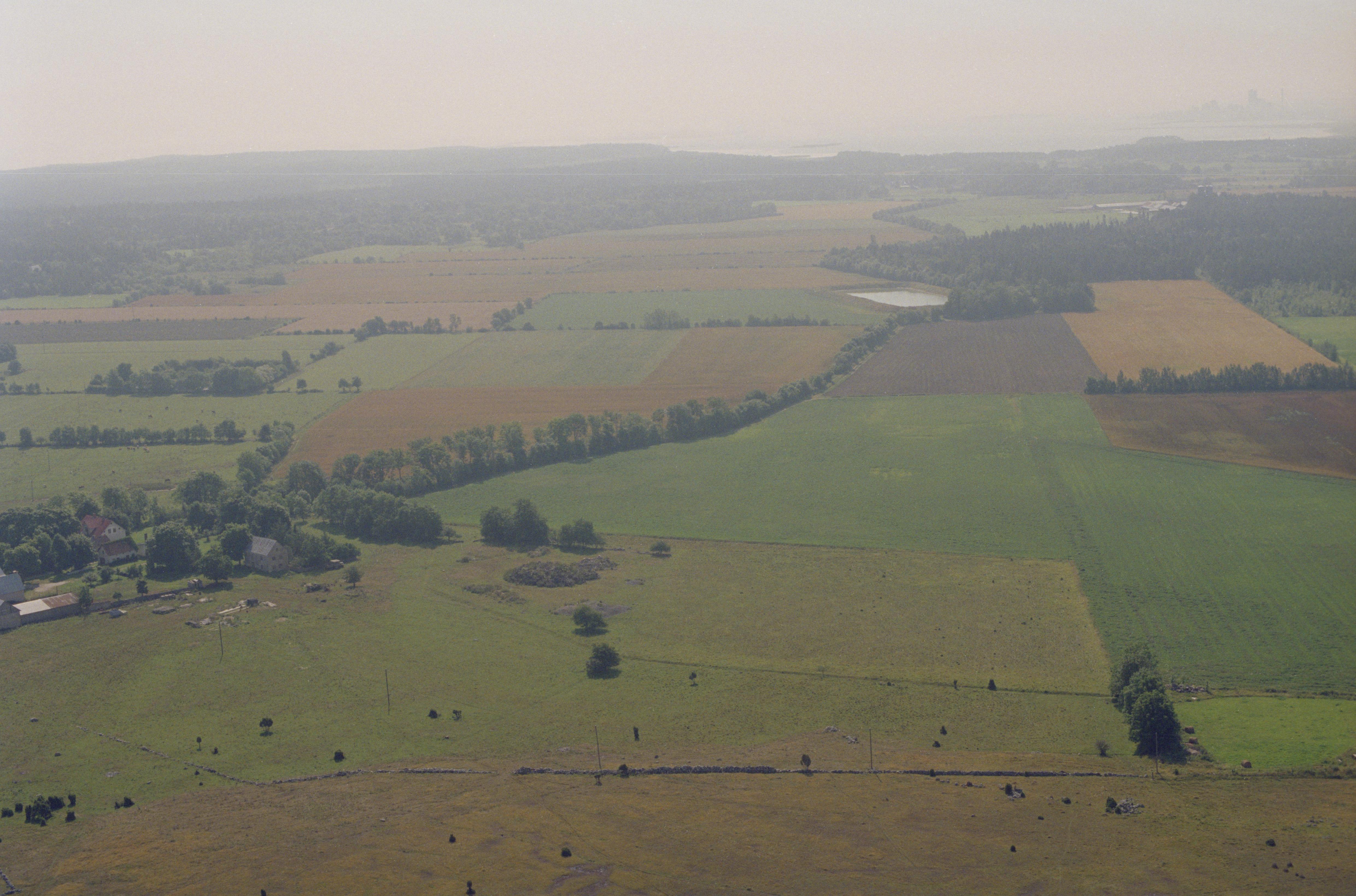 Beskrivning: Området söder om gravfälten Lajkarhajd och Domarlunden. Hägvide gård till vänster. I bildens nedre del stensättningar RAÄnr Lärbro 463:1-2, hägnad Lärbro 264:5 m.fl. Vid bildens mitt boplats RAÄnr Lärbro 624:1, grav Lärbro 199 m.fl. Bilden är tagen mot (väderstreck): S