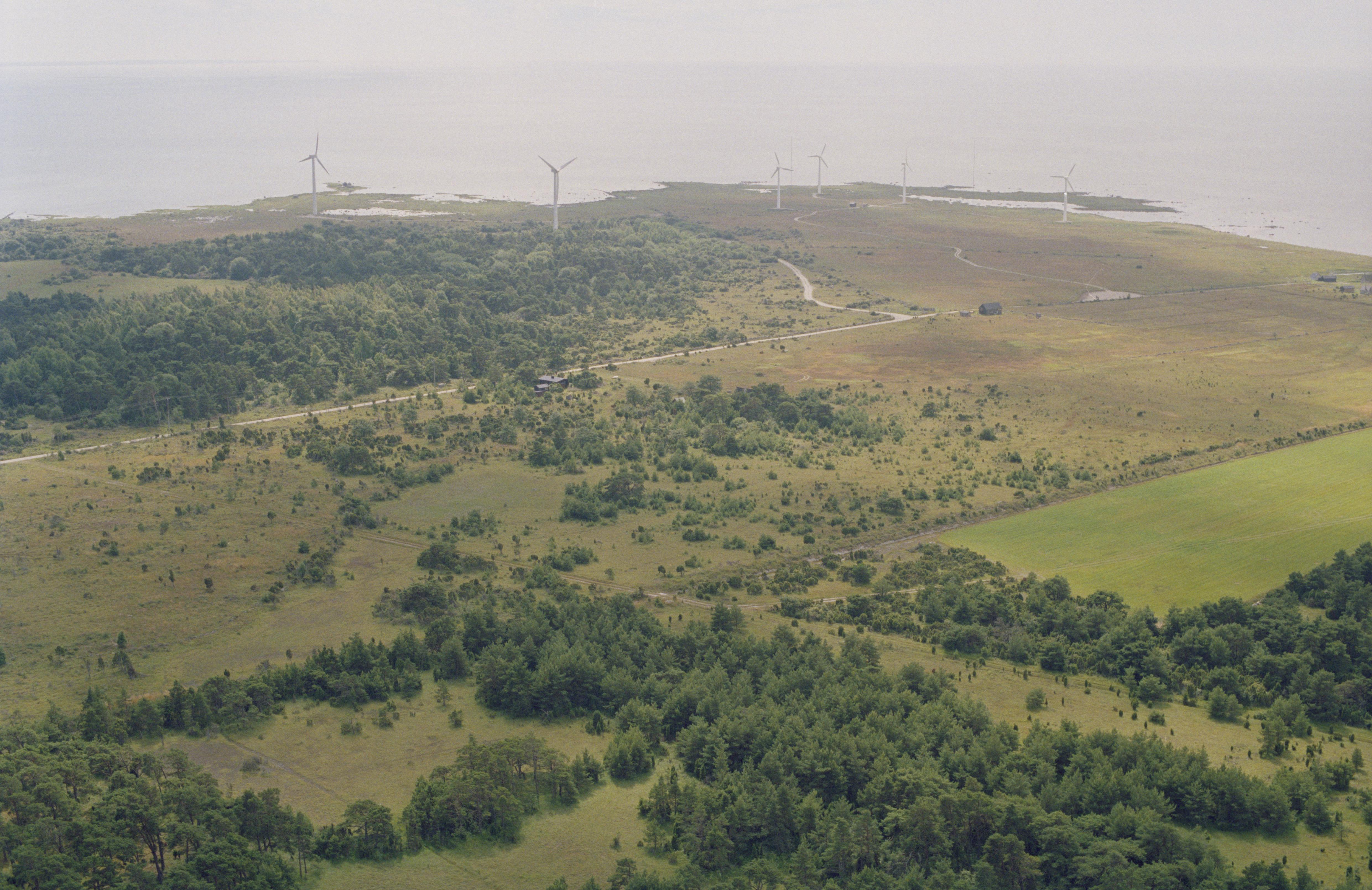 Beskrivning: Vindkraftverk på södra delen av Näsudden. Gården Skåls vid bildens mitt. Bilden är tagen mot (väderstreck): SV