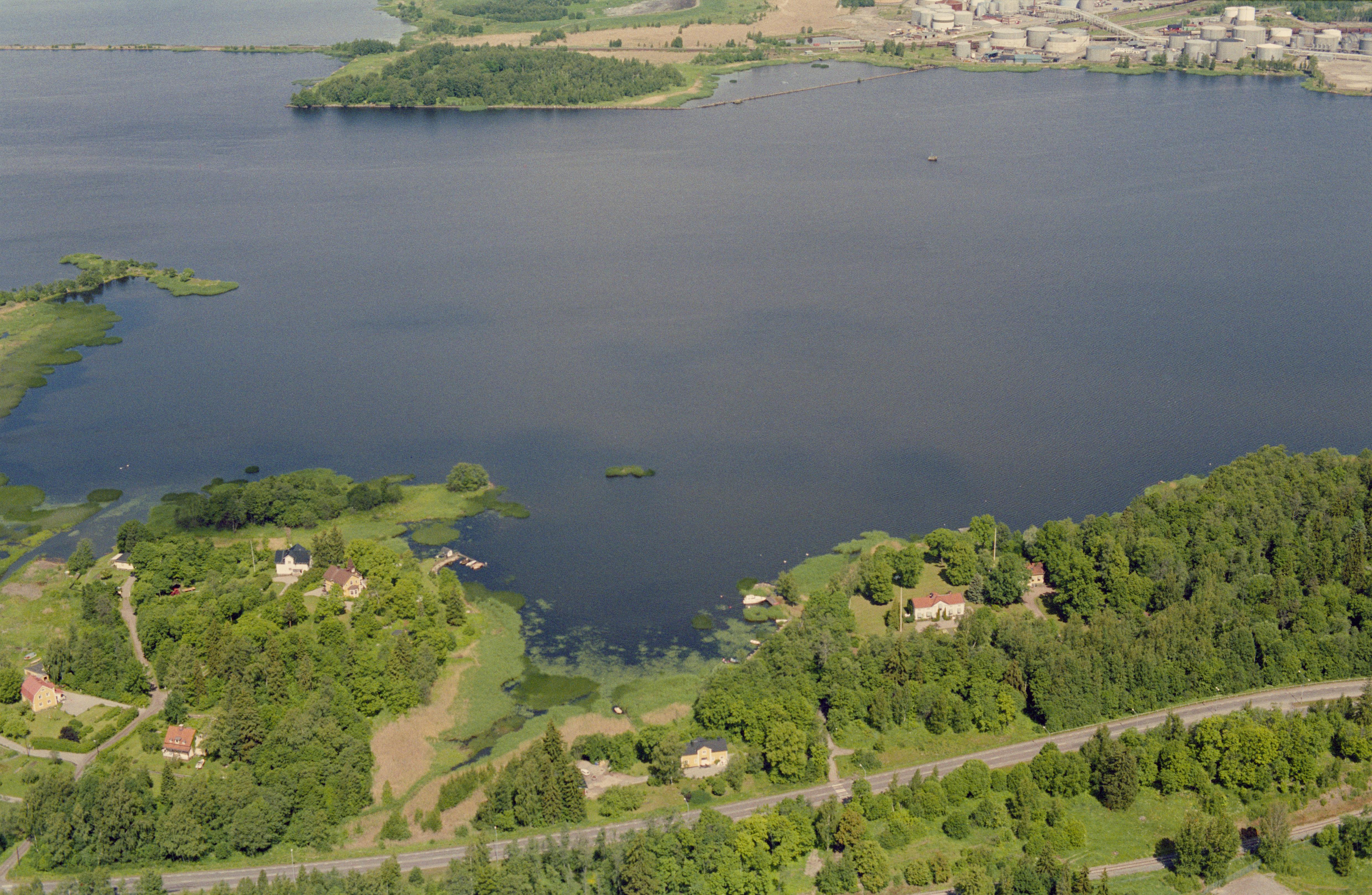 Beskrivning: Gävle tätort vid havsviken Inre fjärden. I bildens nedre del vägarna Österbågen och Nybergsallén söder om områdena Källö och Bomhus i tätortens östra del. Till vänster T-uddens naturreservat. I skogen nere i bildens högra kant fäbodslämning RAÄnr Gävle 209:1. Bilden är tagen mot (väderstreck): NV