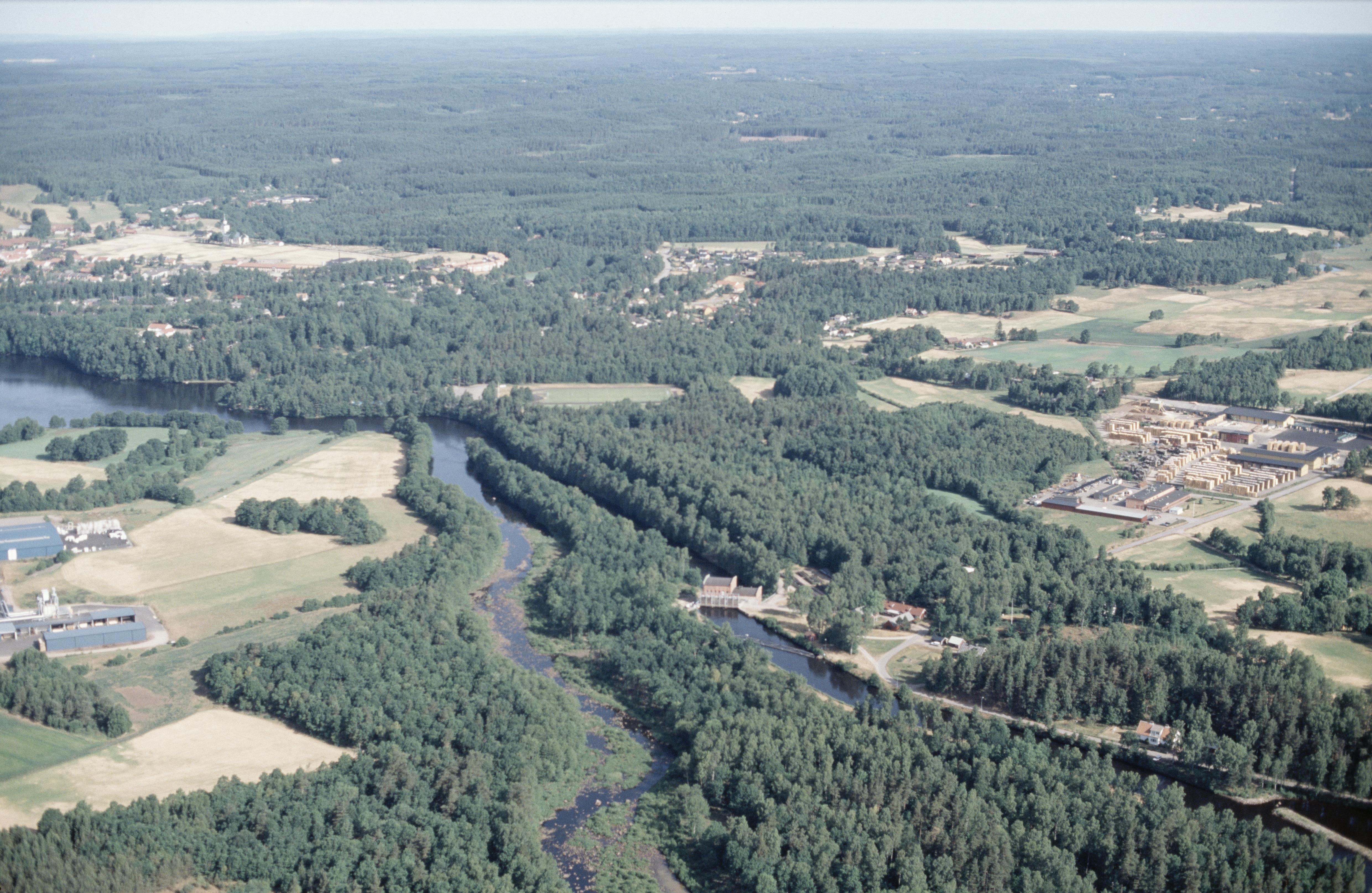 Beskrivning: Ån Lagan sydost om Knäreds tätort. Runt bildens mitt Knäreds kraftverk i Lagadalen. Bilden är tagen mot (väderstreck): N