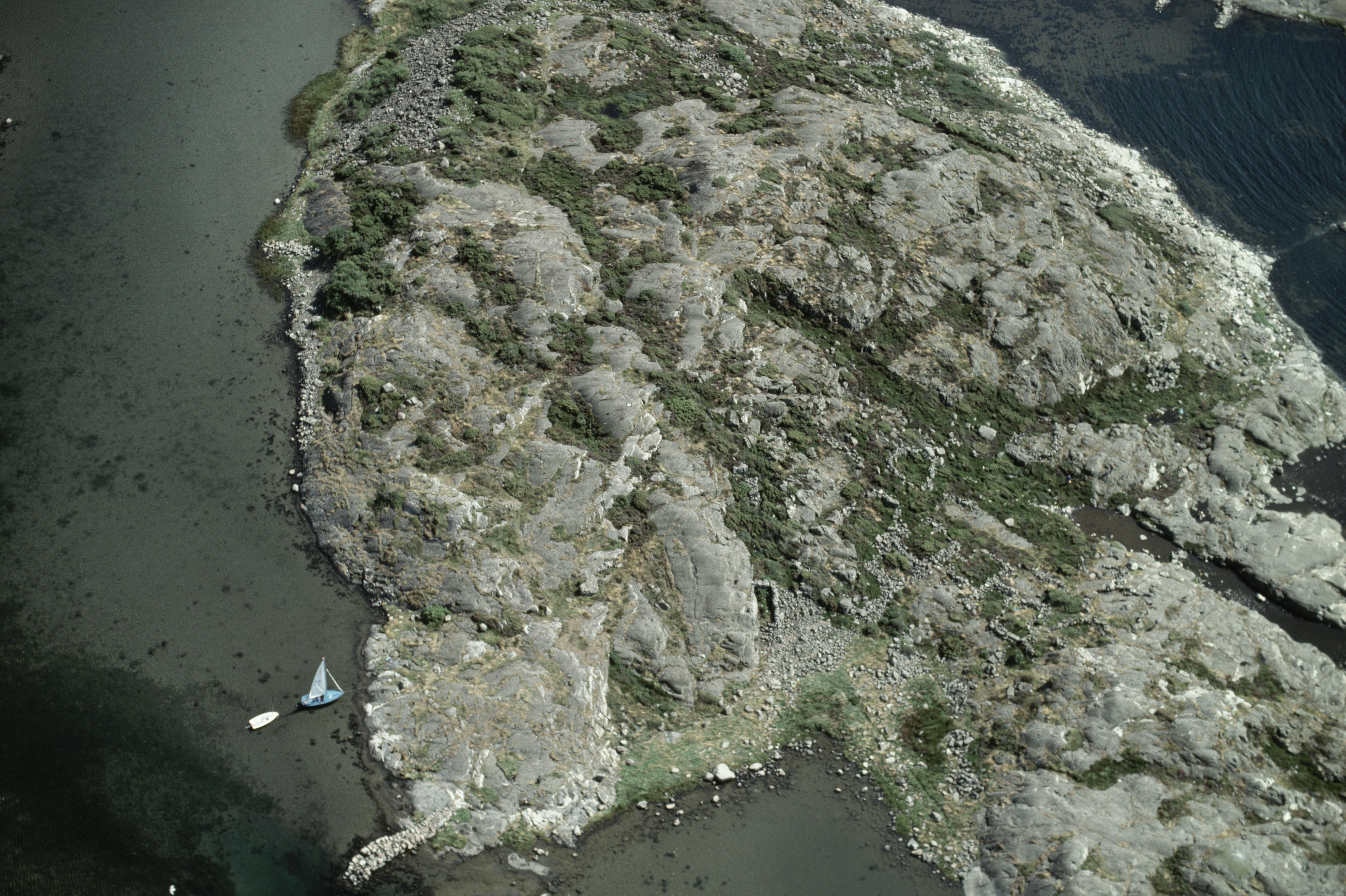 Beskrivning: Tomtningar och fiskelägeslämningar på udden vid Vinbärsholmen. Fiskeläge RAÄnr Vallda 59:1. Bilden är tagen mot (väderstreck): SO