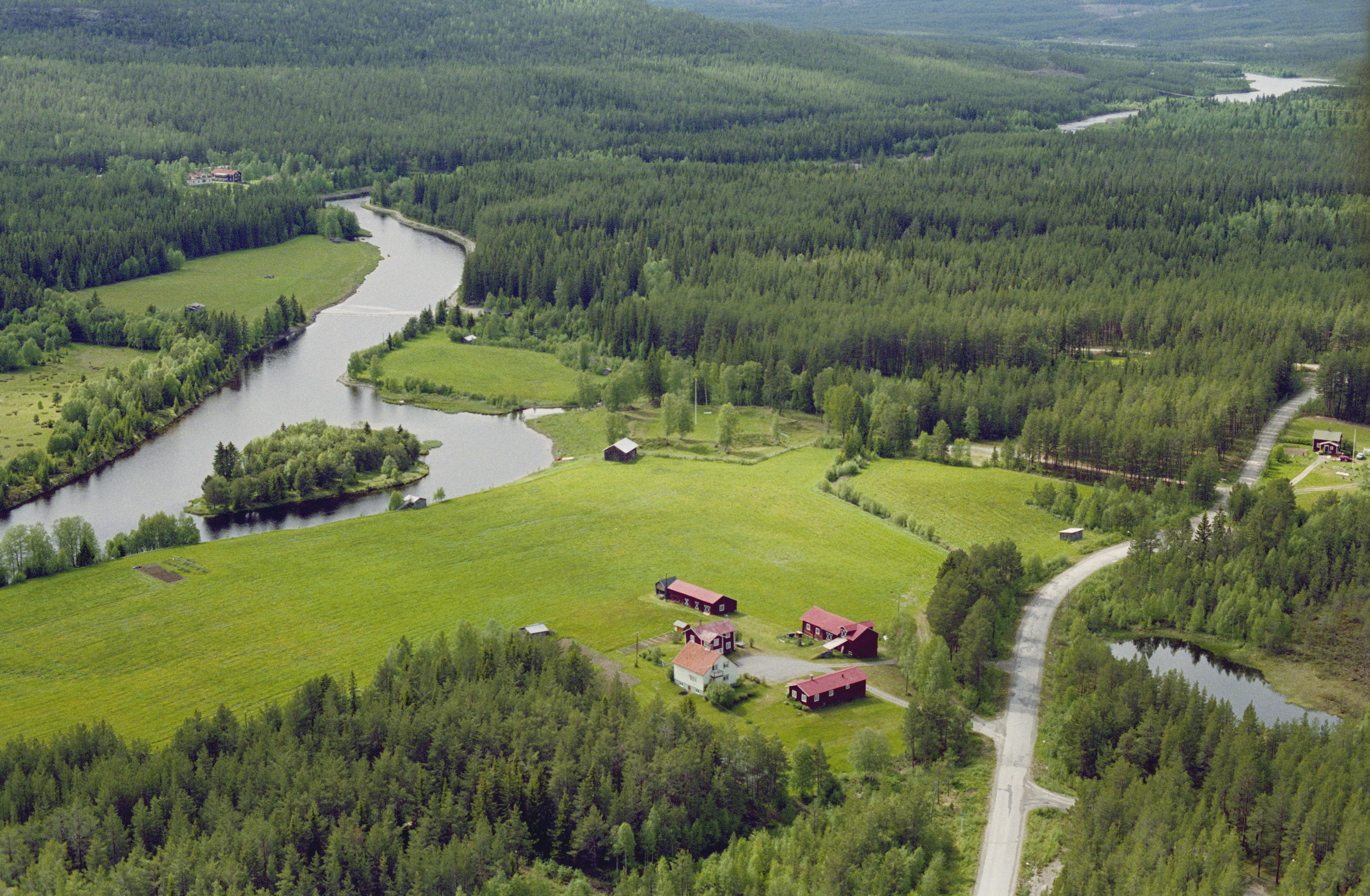 Beskrivning: Älven Ljusnan nordväst i Långå by. Vid bildens mitt Långå skans med minnesmärke RAÄnr Hede 6:1-3. Bilden är tagen mot (väderstreck): V