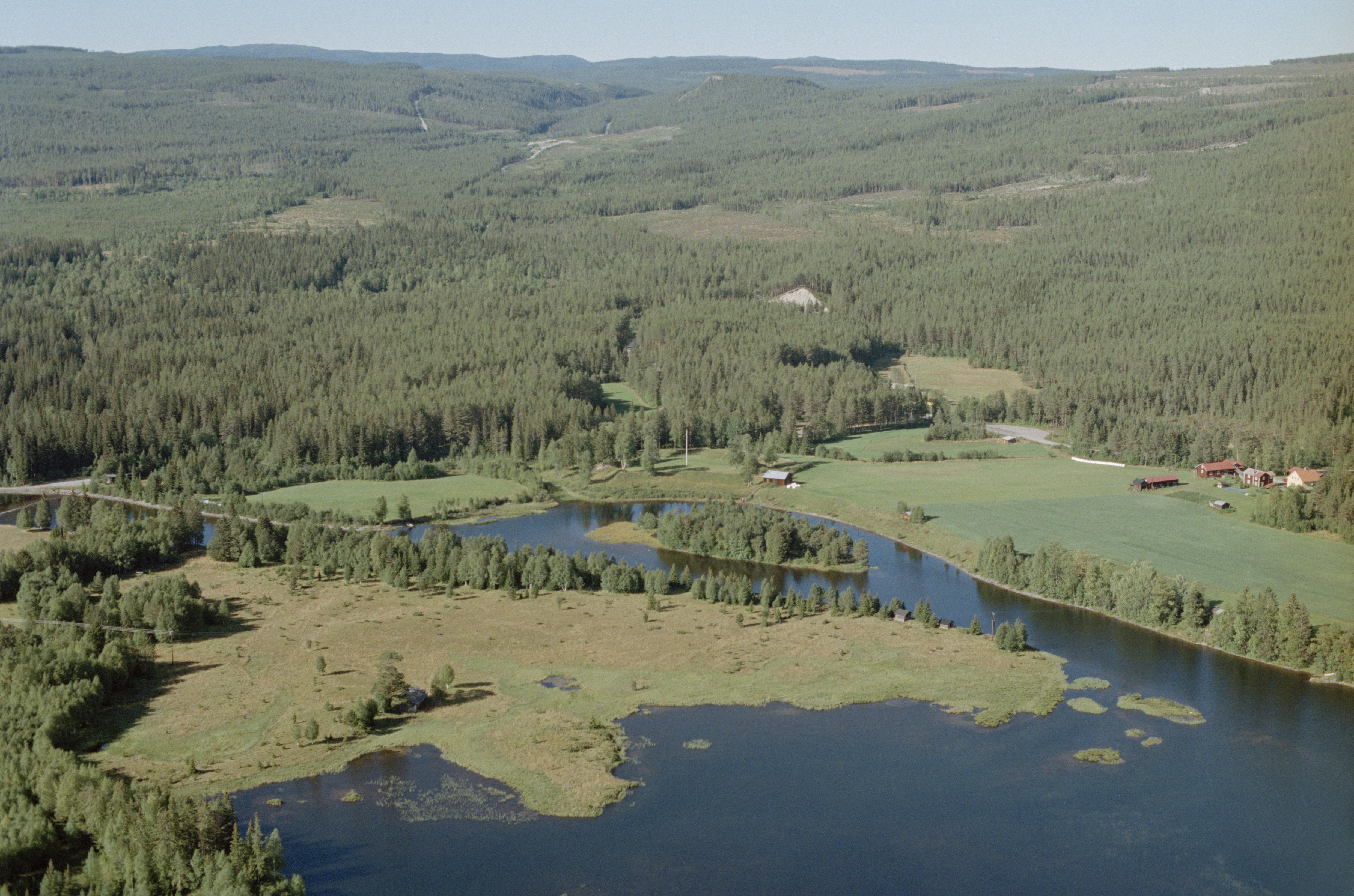Beskrivning: Älven Ljusnan nordväst i Långå by. Vid bildens mitt Långå skans med minnesmärke RAÄnr Hede 6:1-3. Bilden är tagen mot (väderstreck): N