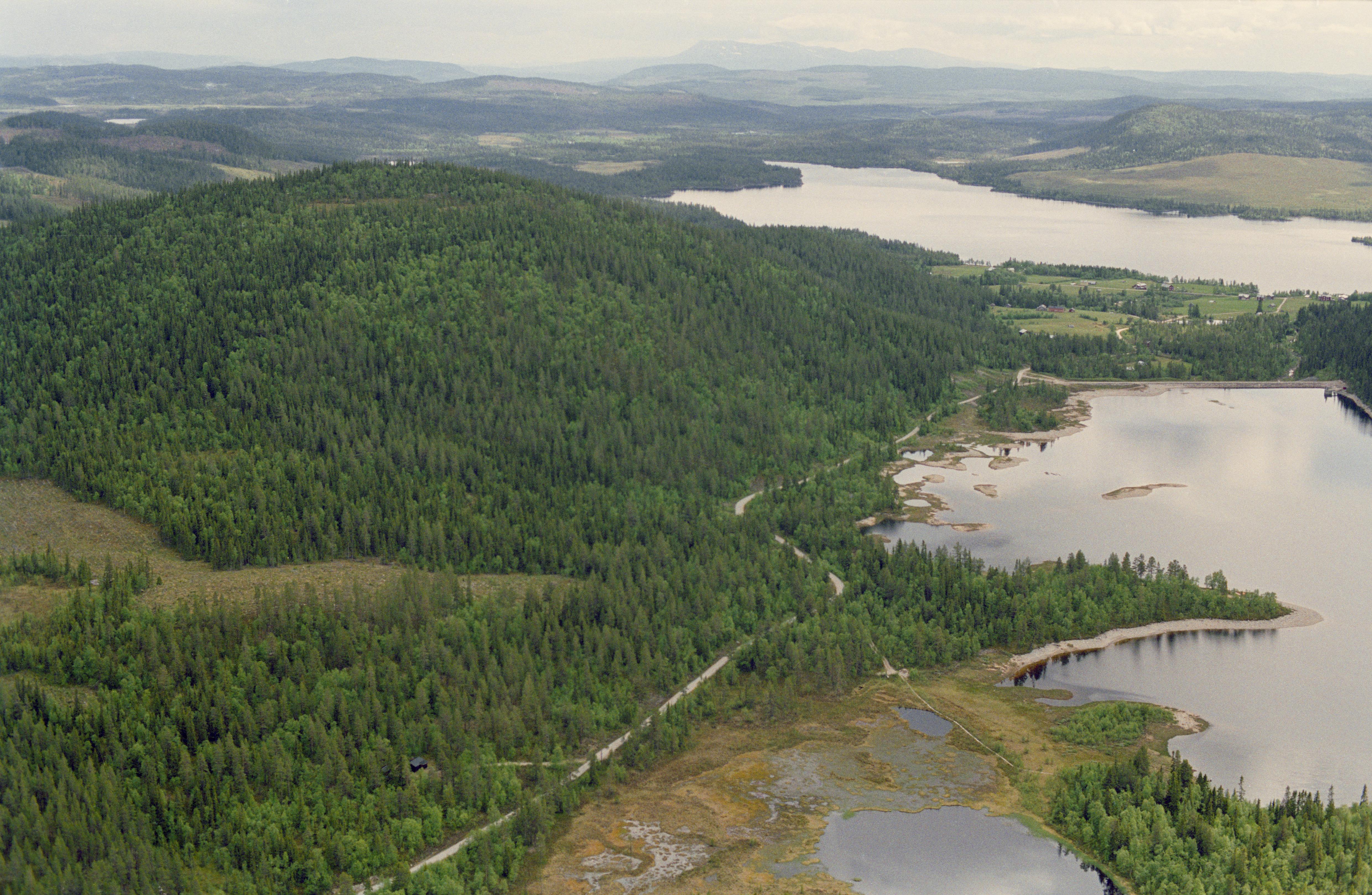 Beskrivning: Beskrivning: Över-Särvsjön med härdar, boplatser m.m. på norra och östra sidan. Grannberget med hällmålning RAÄnr Hede 201:1 uppe till vänster. Under bildens mitt boplats RAÄnr Hede 258:1-4 m.fl. Uppe till höger Grannbergets by vid Neder-Särvsjön. Bilden är tagen mot (väderstreck): S Fotosyfte: Flygbildsdokumentation