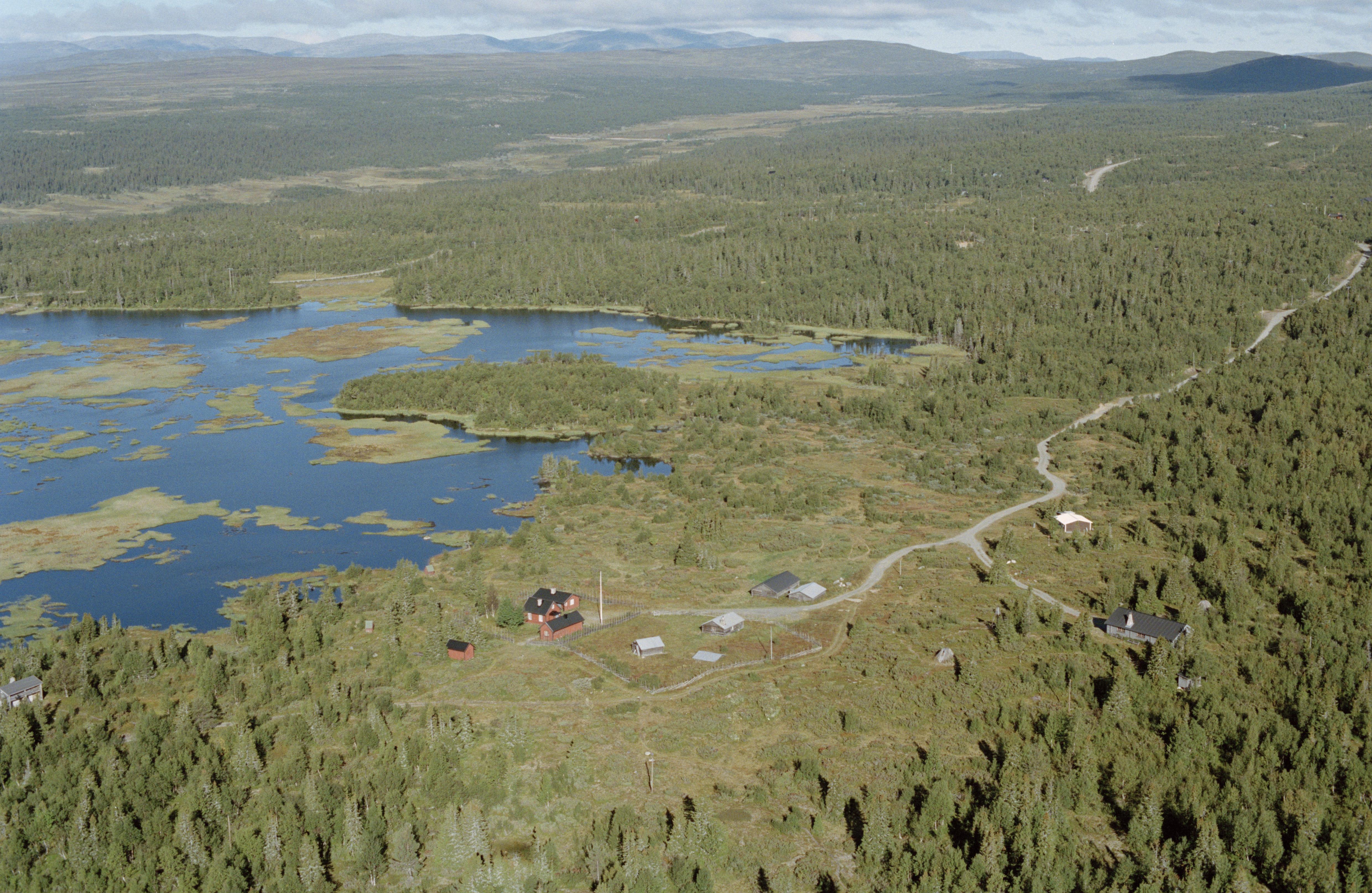 Beskrivning: Arådalens naturreservat. Vid bildens mitt Arådalens fjällstation vid Angelikasjön. Arådalens kapell under bildens mitt. I skogen över bildens mitt kåta RAÄnr Oviken 276:1-2 vid området Väster-Arådalen. Bilden är tagen mot (väderstreck): NV