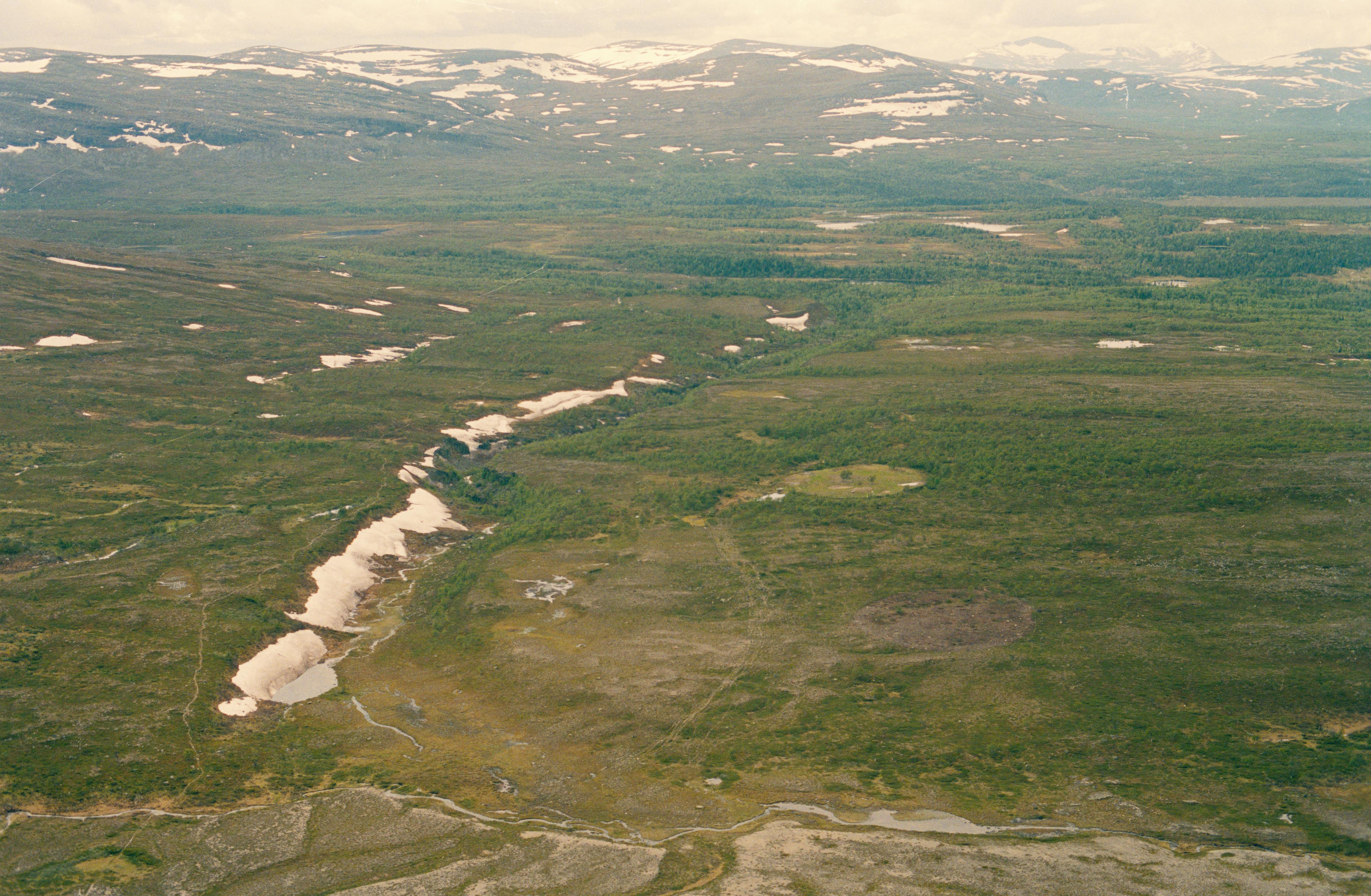 Beskrivning: Dalgång mellan fjällen Stor-Gröngumpen (Suenjere) och Lill-Gröngumpen (Joevaarta), norr om Lunndörrsfjällen. Vid bildens mitt sameviste med rengärden. Nere till höger rengärde RAÄnr Undersåker 455 m.m. Bilden är tagen mot (väderstreck): SV