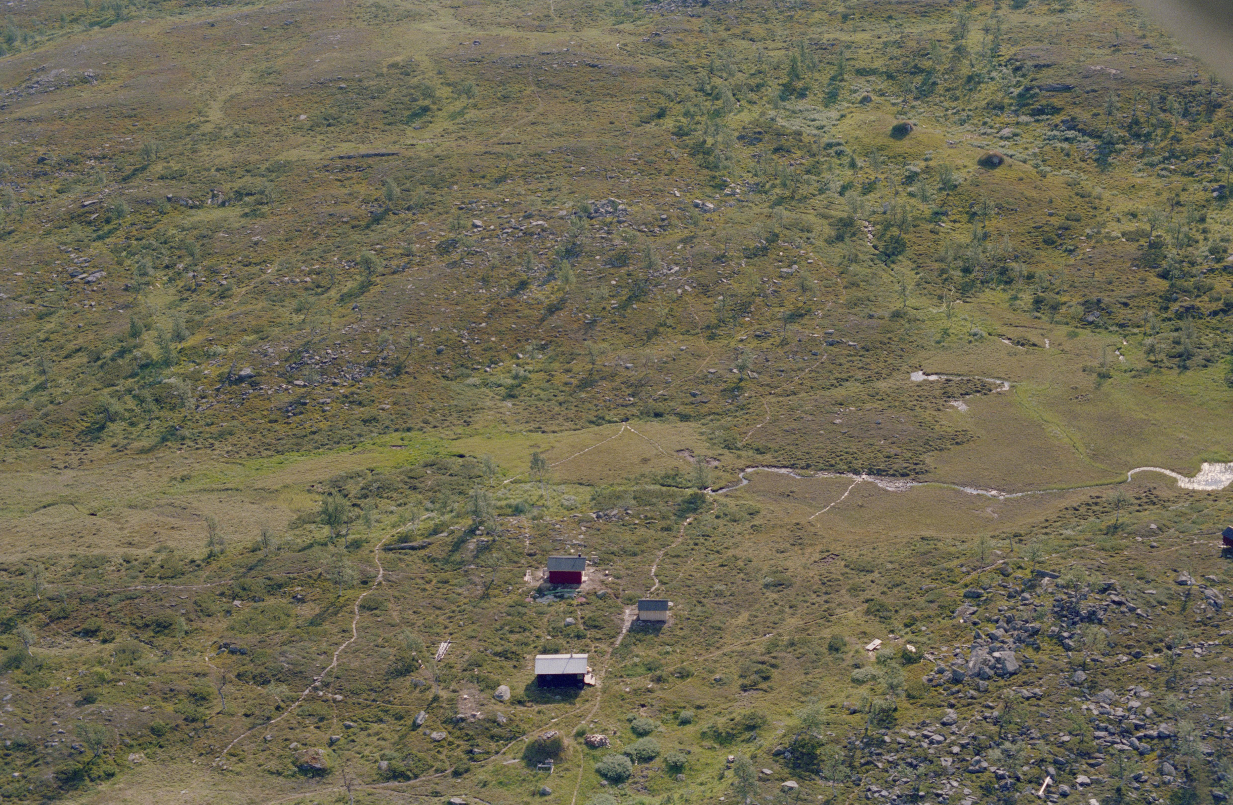 Beskrivning: Samevistet Parka (Bárkka), sydvästra delen. Byggnader i samevistet öster om sjön Jiervajávrátj. I bildens övre del fångstgropssystem RAÄnr Arjeplog 330:1. Bilden är tagen mot (väderstreck): OSO