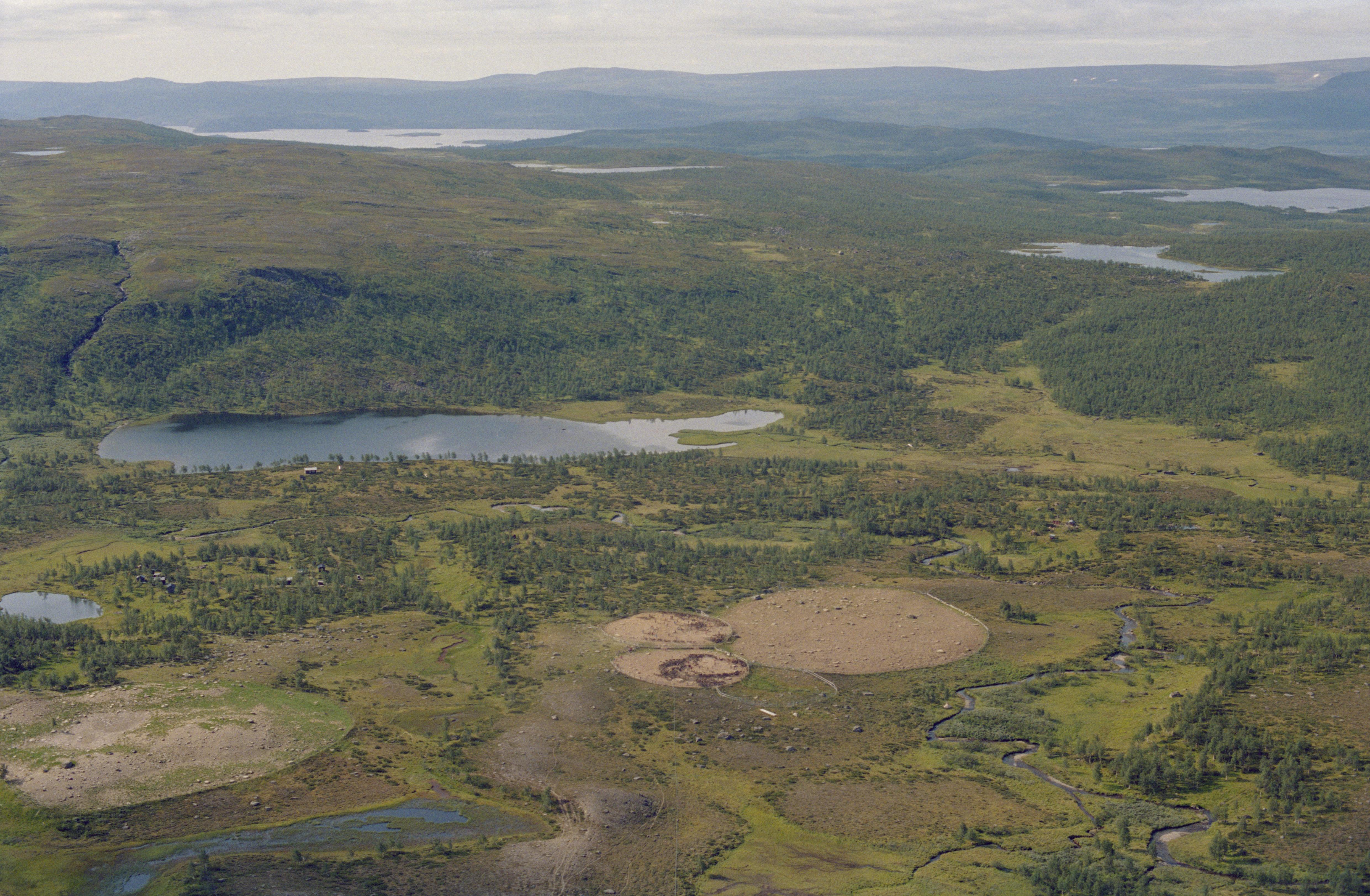 Beskrivning: Samevistet Parka (Bárkka). Till vänster om bildens mitt fångstgropssystem RAÄnr Arjeplog 327:1 vid sjön Unna Parkajaure (Unna Bárkájávrre). Under bildens mitt rengärden med renskiljning. Bilden är tagen mot (väderstreck): S