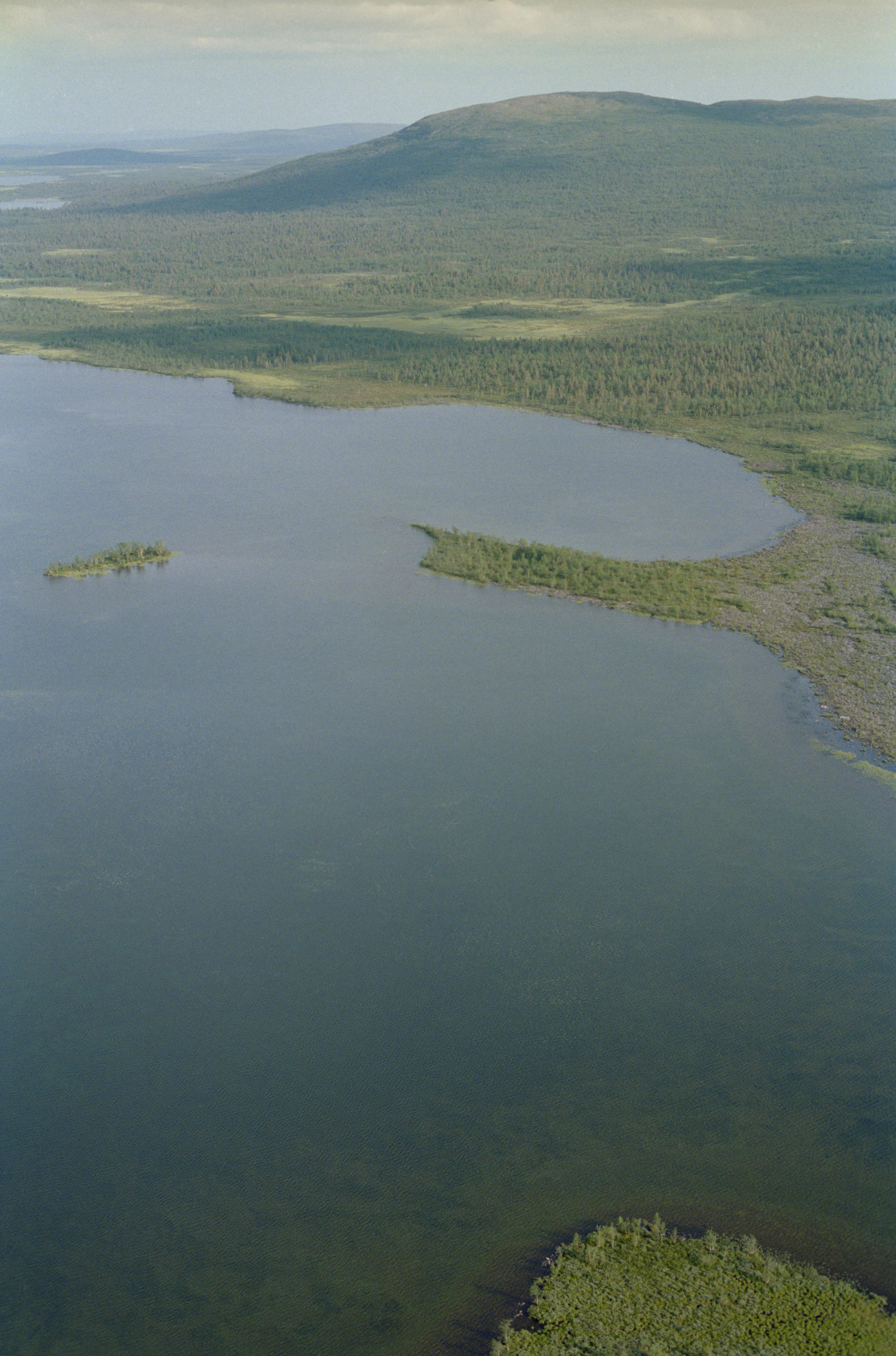 Beskrivning: Två samiska offerplatser i området Haltiosaari i Saivorova by vid sjön Isosaivo. På udden vid bildens mitt offerplats RAÄnr Gällivare 73:1 och på holmen (till vänster om udden) offerplats Gällivare 97:1. Bilden är tagen mot (väderstreck): OSO