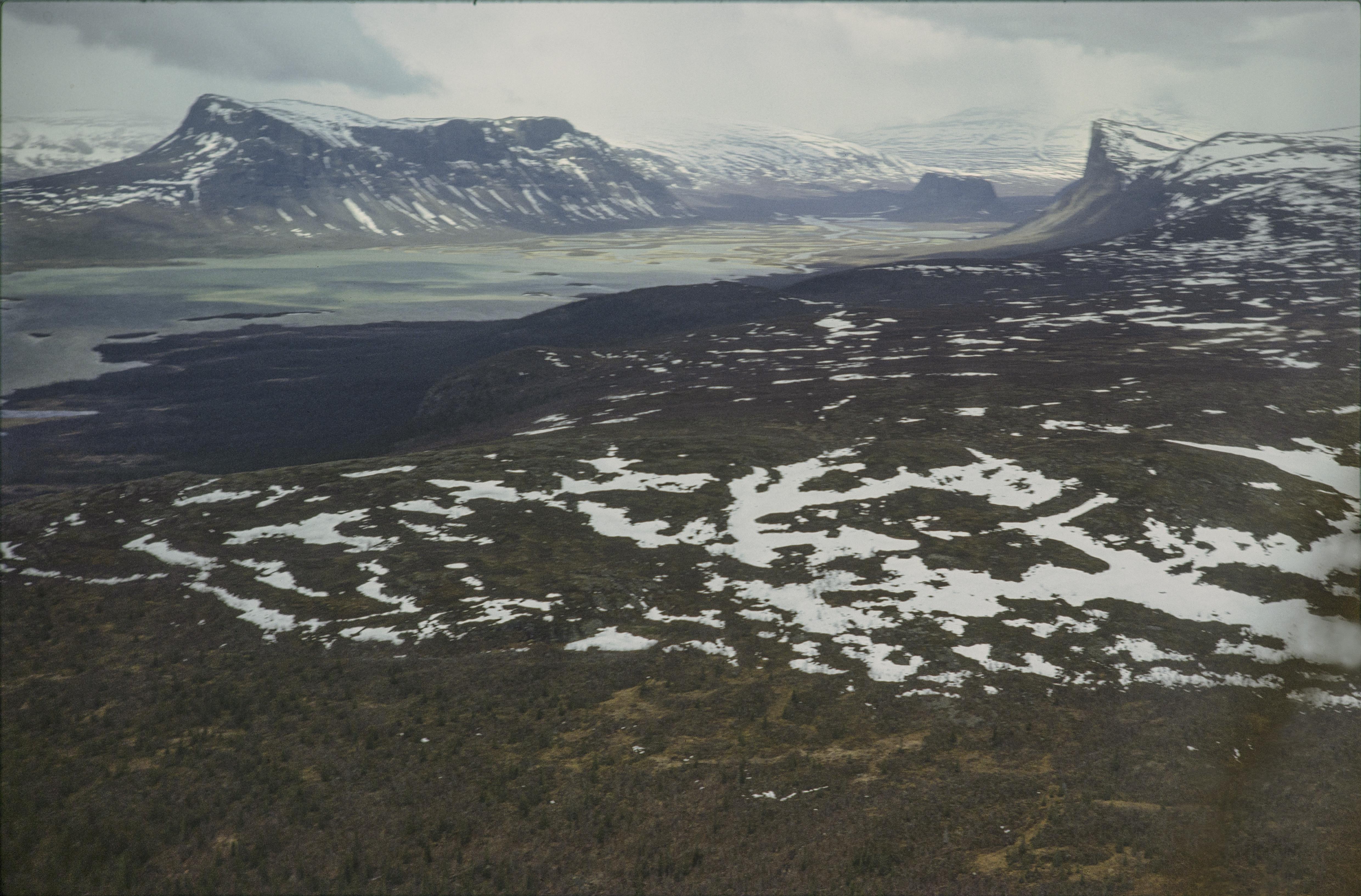 Beskrivning: Uppe till vänster området Tjakkeli (Tjahkelij) och Rapadeltat i sjön Laitaure (Lájtávrre / Laitjaure). På en holme i sjön gravplats RAÄnr Jokkmokk 4:1. Uppe till höger fjället Skierffe i Rapadalen (Ráhpavuobme). Nere till vänster Aktse fjällhemman. Kungsleden (en vandringsled) går förbi Aktse. Ultevis fjällurskogs naturreservat. Bilden är tagen mot (väderstreck): V