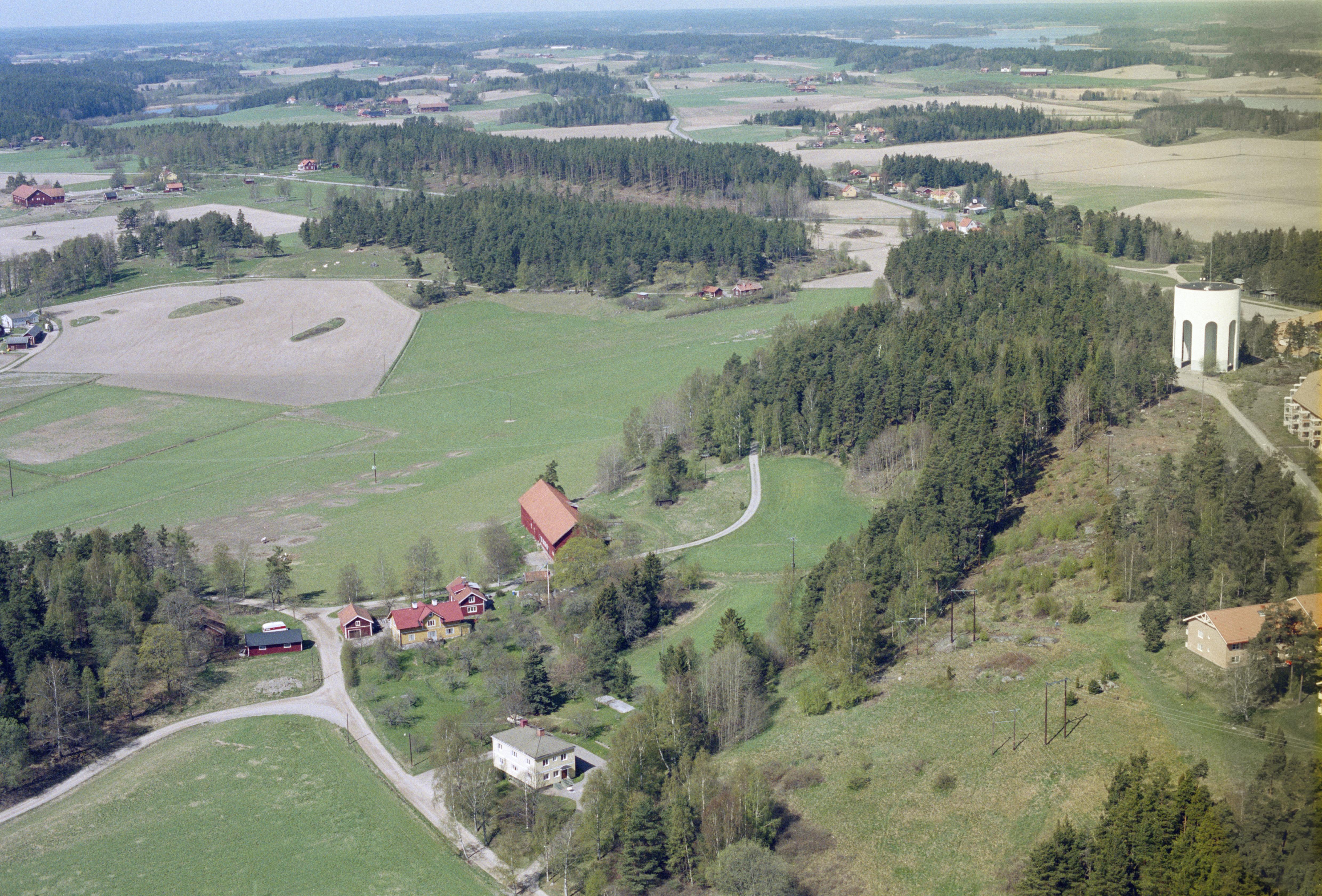 Beskrivning: Österkärv nere till vänster, vattentornet uppe till höger. Vid bildens mitt gravfält RAÄnr Frustuna 31:1. Bilden är tagen mot (väderstreck): NV