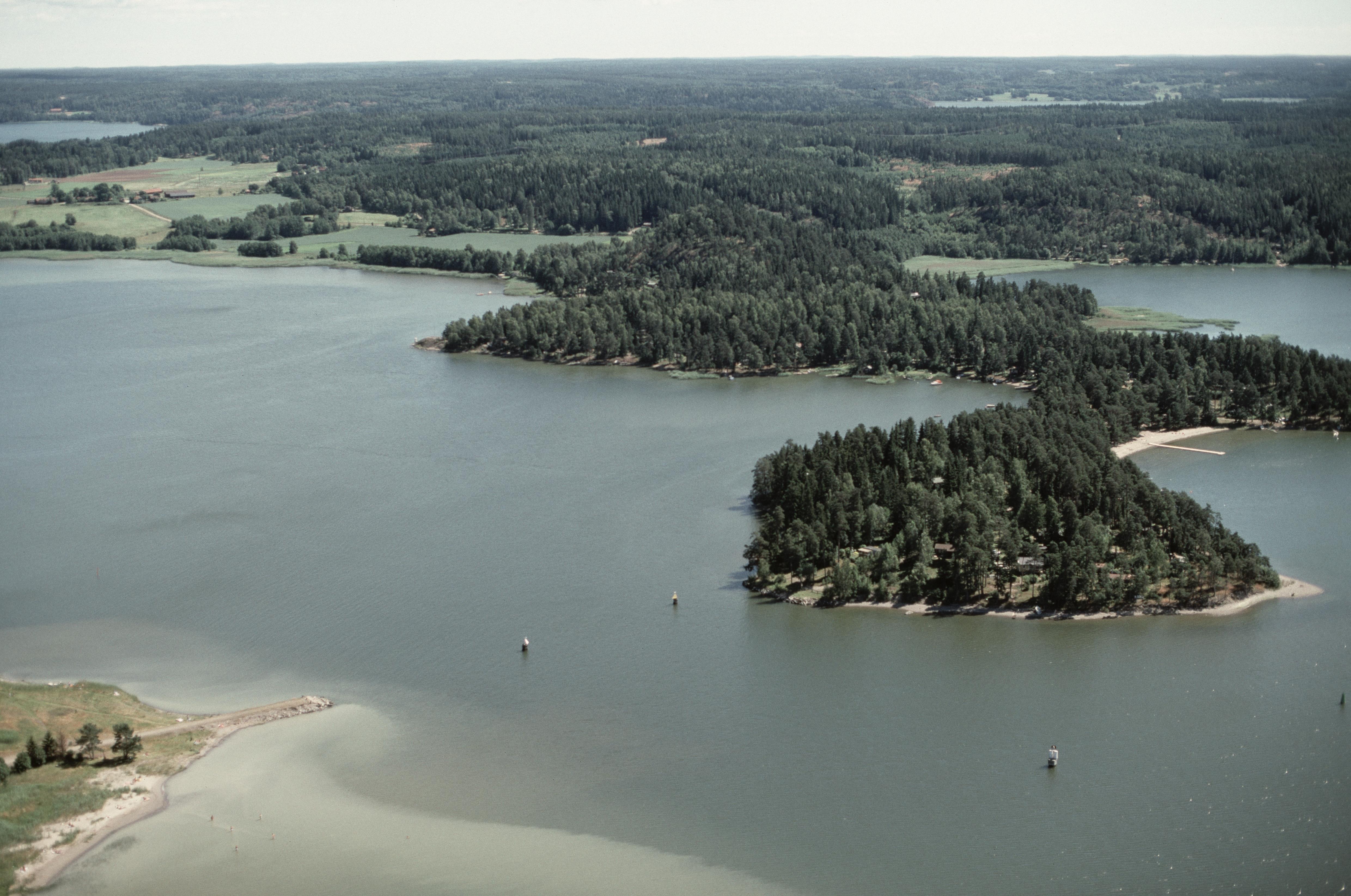 Beskrivning: Uppe till vänster Näs by vid Brandalsund i Hallstafjärden. Vid bildens mitt fornborg RAÄnr Grödinge 507:1 på Sundsudden. Bilden är tagen mot (väderstreck): Ö