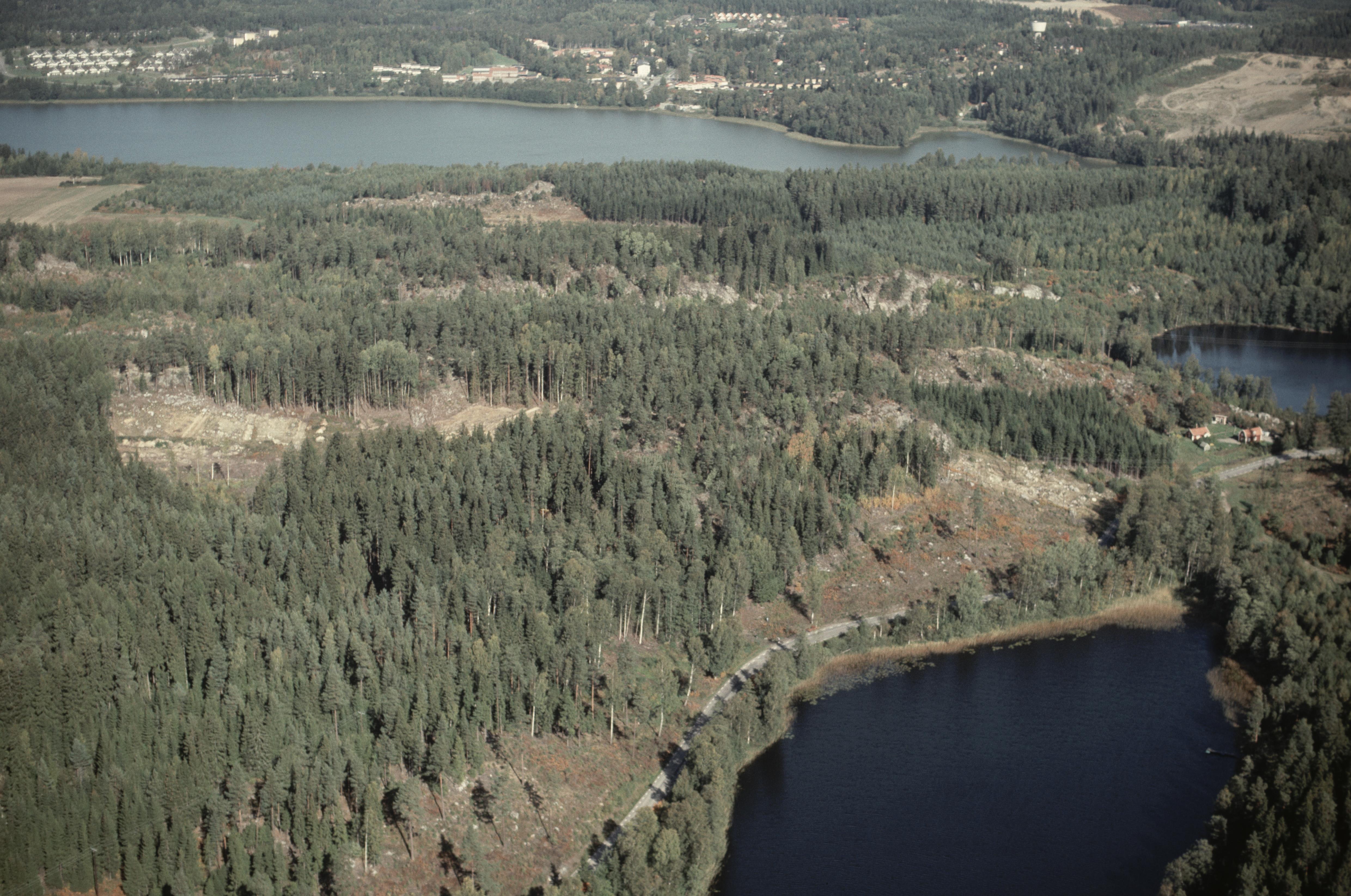 Beskrivning: Arkeologisk undersökning innan järnvägen Grödingebanan byggs. Vid bildens mitt fornborg RAÄnr Grödinge 52:1 vid Kyrktorp. Kvarnsjön i bildens nedre del, sjön Getryggen till höger om bildens mitt. I bildens övre del Malmsjön. Bilden är tagen mot (väderstreck): NO