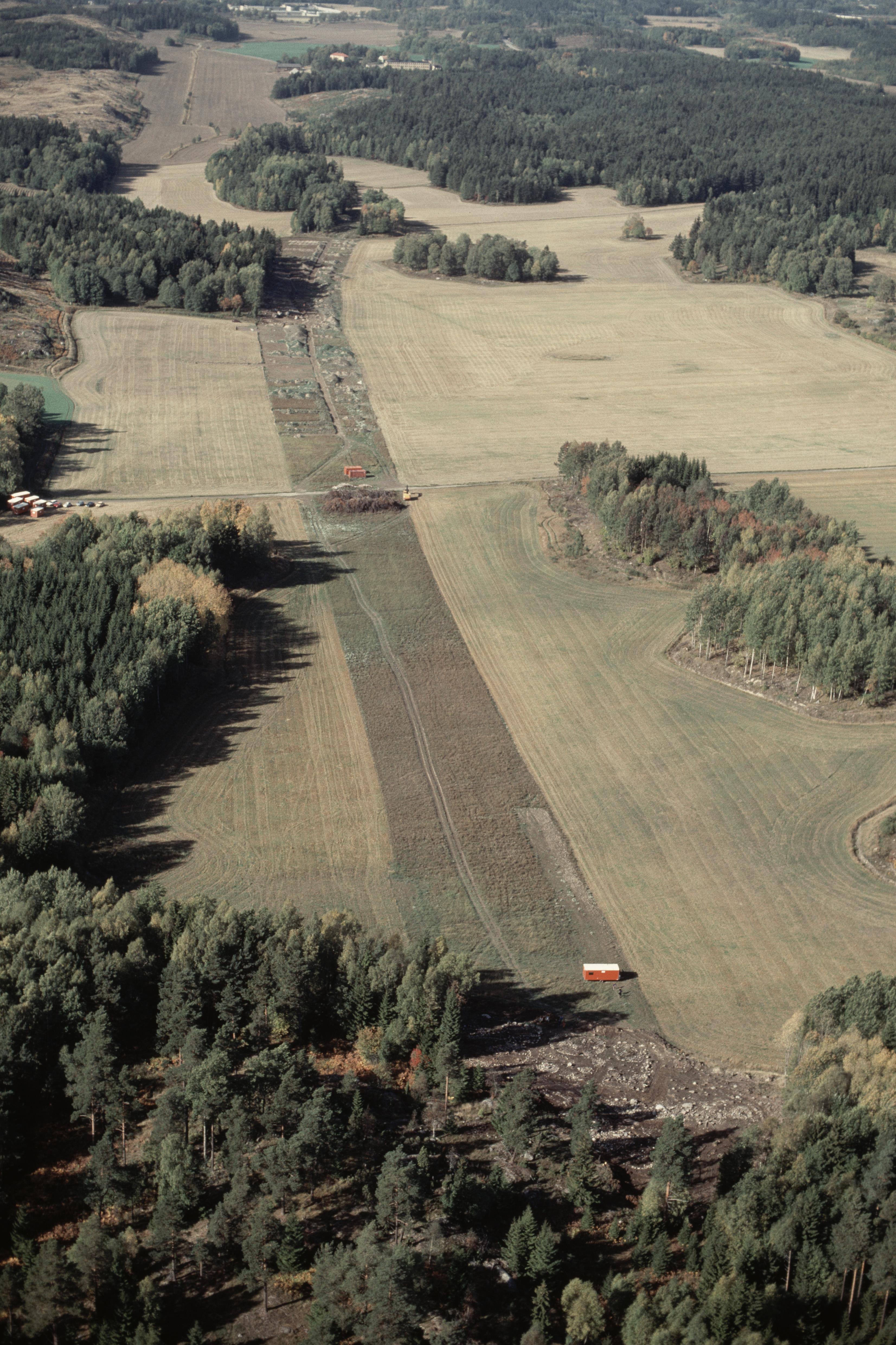 Beskrivning: Arkeologisk undersökning innan järnvägen Grödingebanan byggs. I bildens nedre del gravfält RAÄnr Grödinge 432:1, över bildens mitt boplats Grödinge 586:1-2 m.fl. söder om Tyttinge gård. Bilden är tagen mot (väderstreck): VNV