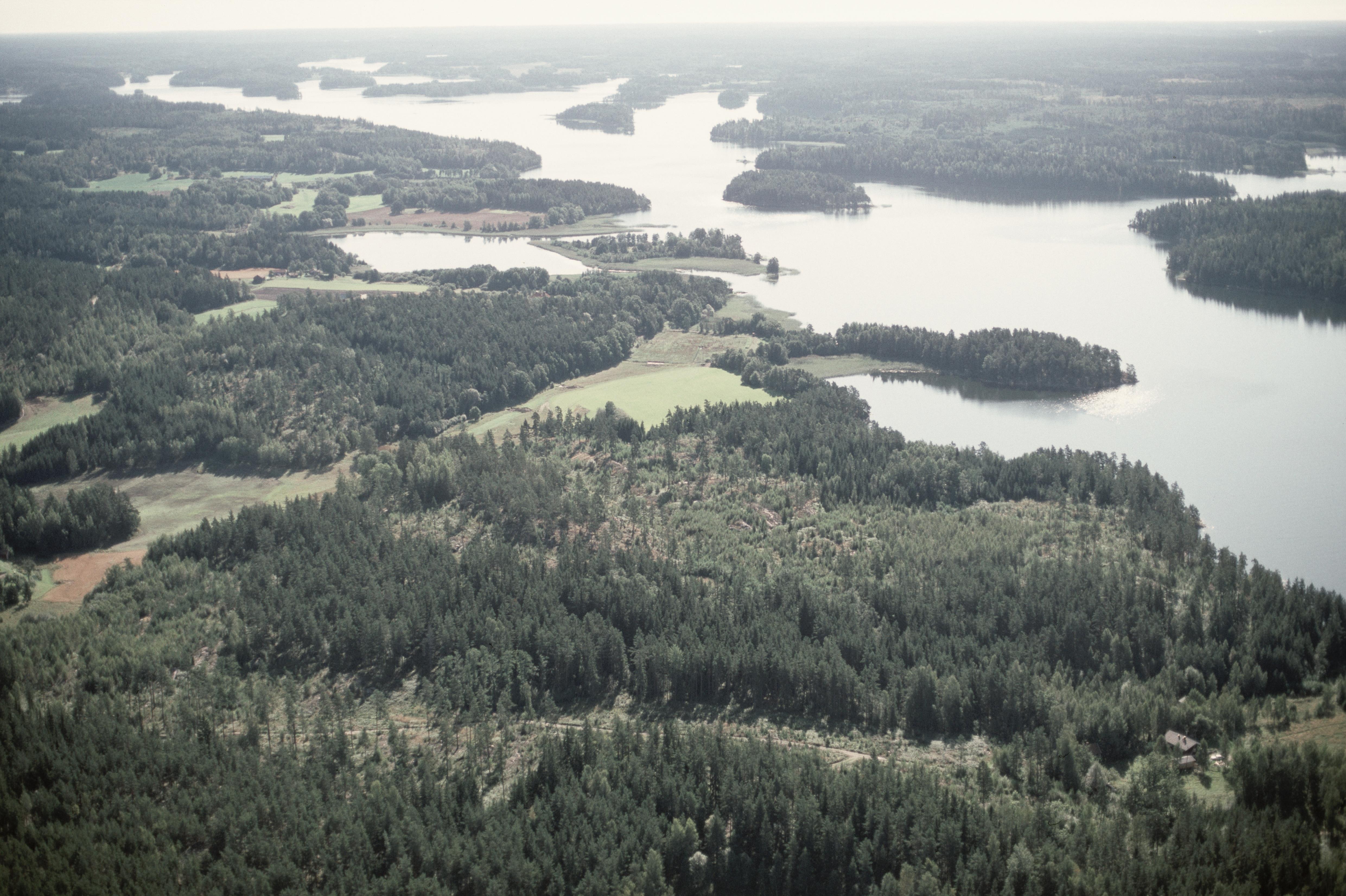 Beskrivning: Hyltingeö vid sjön Båven. I sjön går gränsen mellan socknen Hyltinge och Helgesta. Vid bildens mitt Pumphusudden och Saxängens herrgård. Bilden är tagen mot (väderstreck): SO