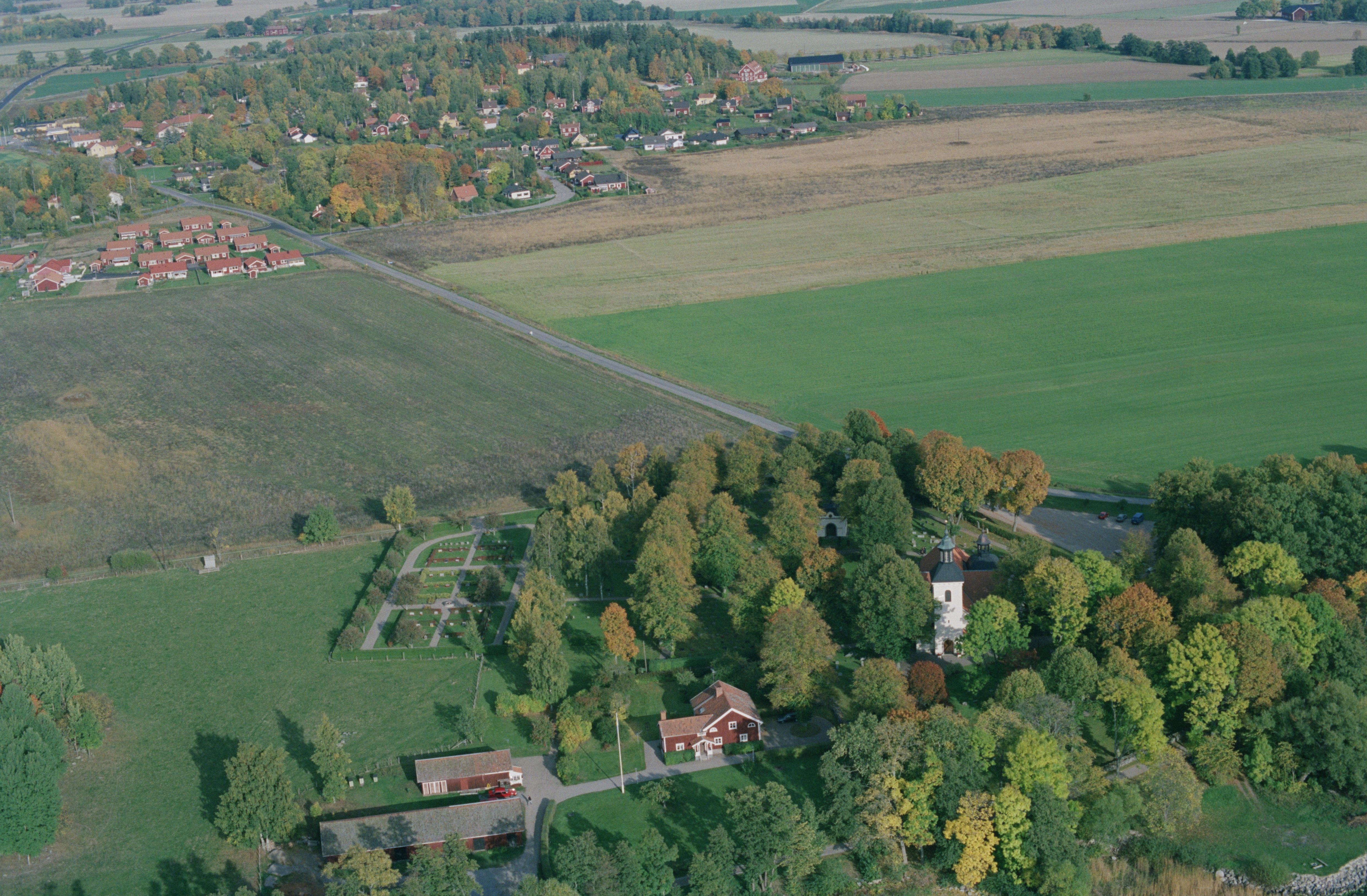 Beskrivning: Nere till höger Julita kyrka vid sjön Öljaren. I bildens övre del byn Äsköping. Bilden är tagen mot (väderstreck): Ö
