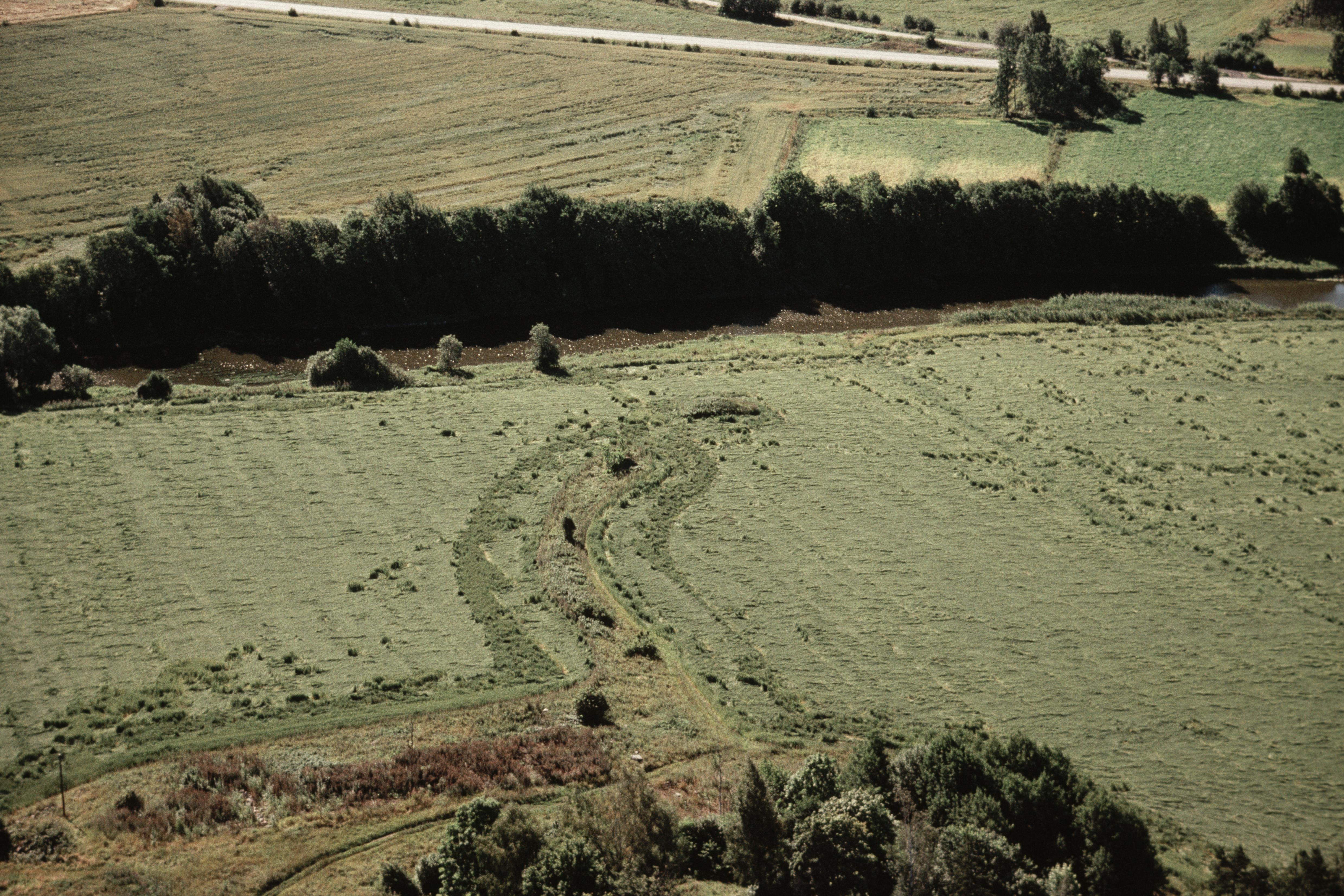 Beskrivning: Broby gamla tomt RAÄnr Helgona 54:1 i bildens nedre del. Vid bildens mitt hällristning RAÄnr Helgona 126:1. Över bildens mitt Nyköpingsån som markerar gränsen mot socknet Nyköping. Bilden är tagen mot (väderstreck): S