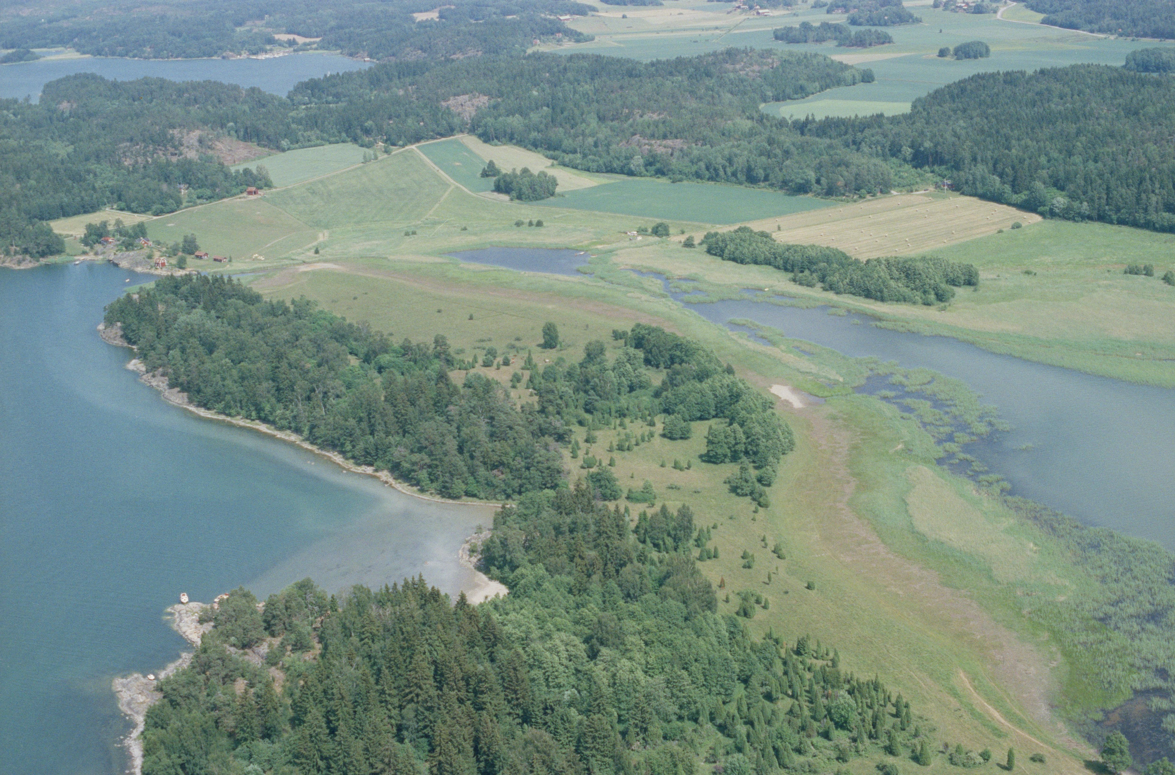 Beskrivning: Ängar på udden Koholmen vid Koholmsviken i Himmerfjärden. Nere till vänster stensättning RAÄnr Sorunda 515:1. Bilden är tagen mot (väderstreck): NNO