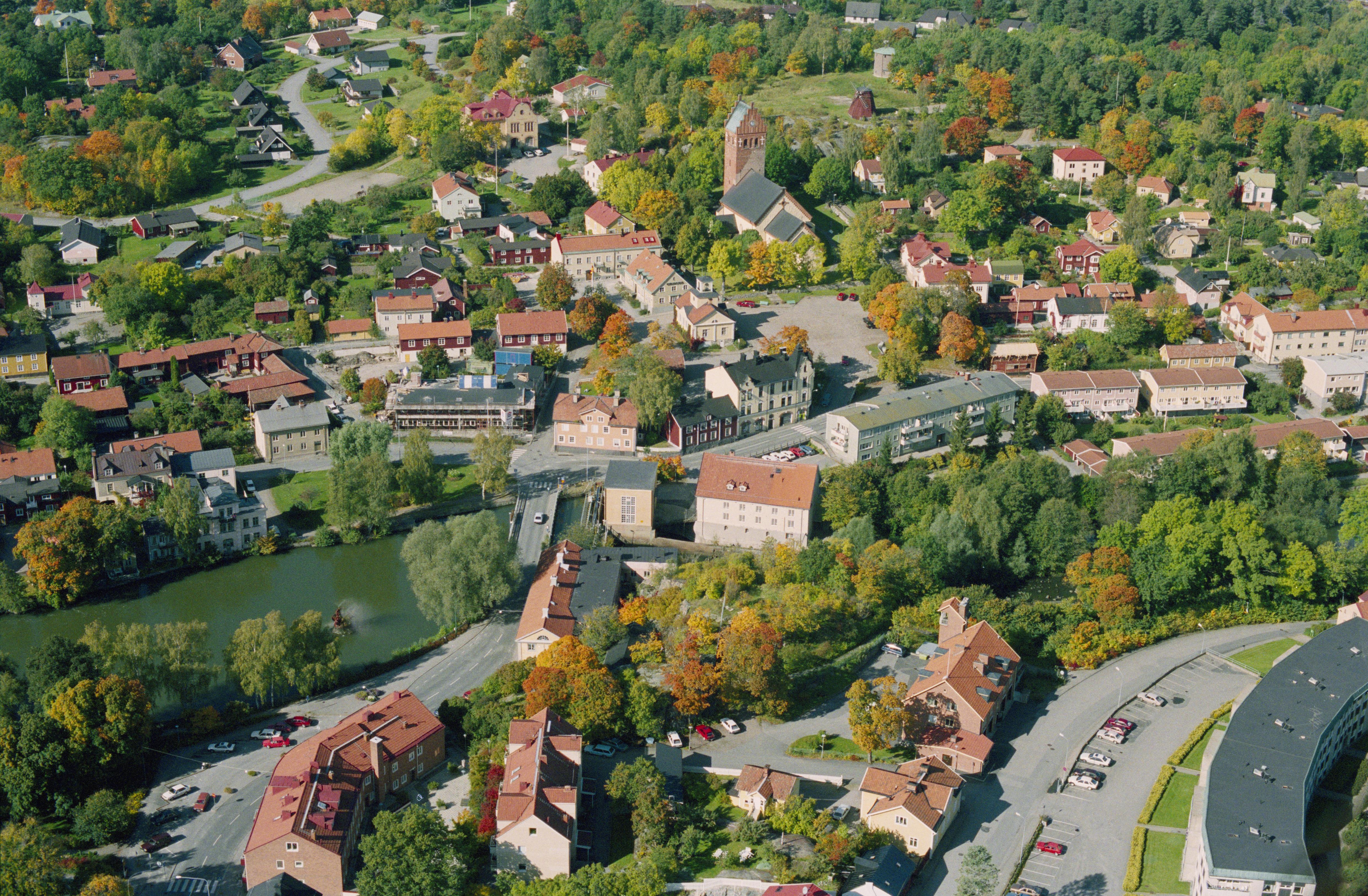 Beskrivning: Torshälla tätort. Eskilstunaån. Borgruin RAÄnr Torshälla 71:1 till höger om bildens mitt. I bildens övre del stadslager RAÄnr Torshälla 95:1 och Torshälla kyrka. Bilden är tagen mot (väderstreck): NV