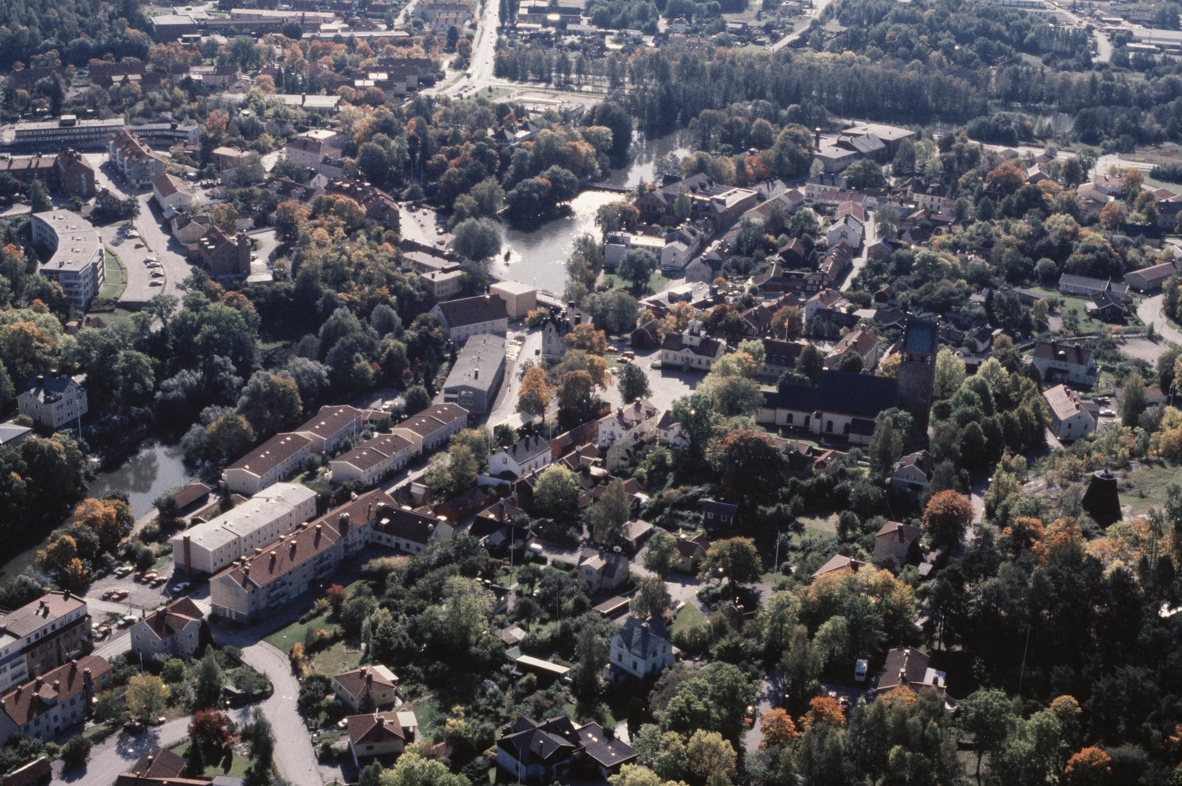 Beskrivning: Torshälla tätort. Eskilstunaån. Borgruin RAÄnr Torshälla 71:1 till vänster om bildens mitt. I bildens högra del stadslager RAÄnr Torshälla 95:1 och Torshälla kyrka. Bilden är tagen mot (väderstreck): S