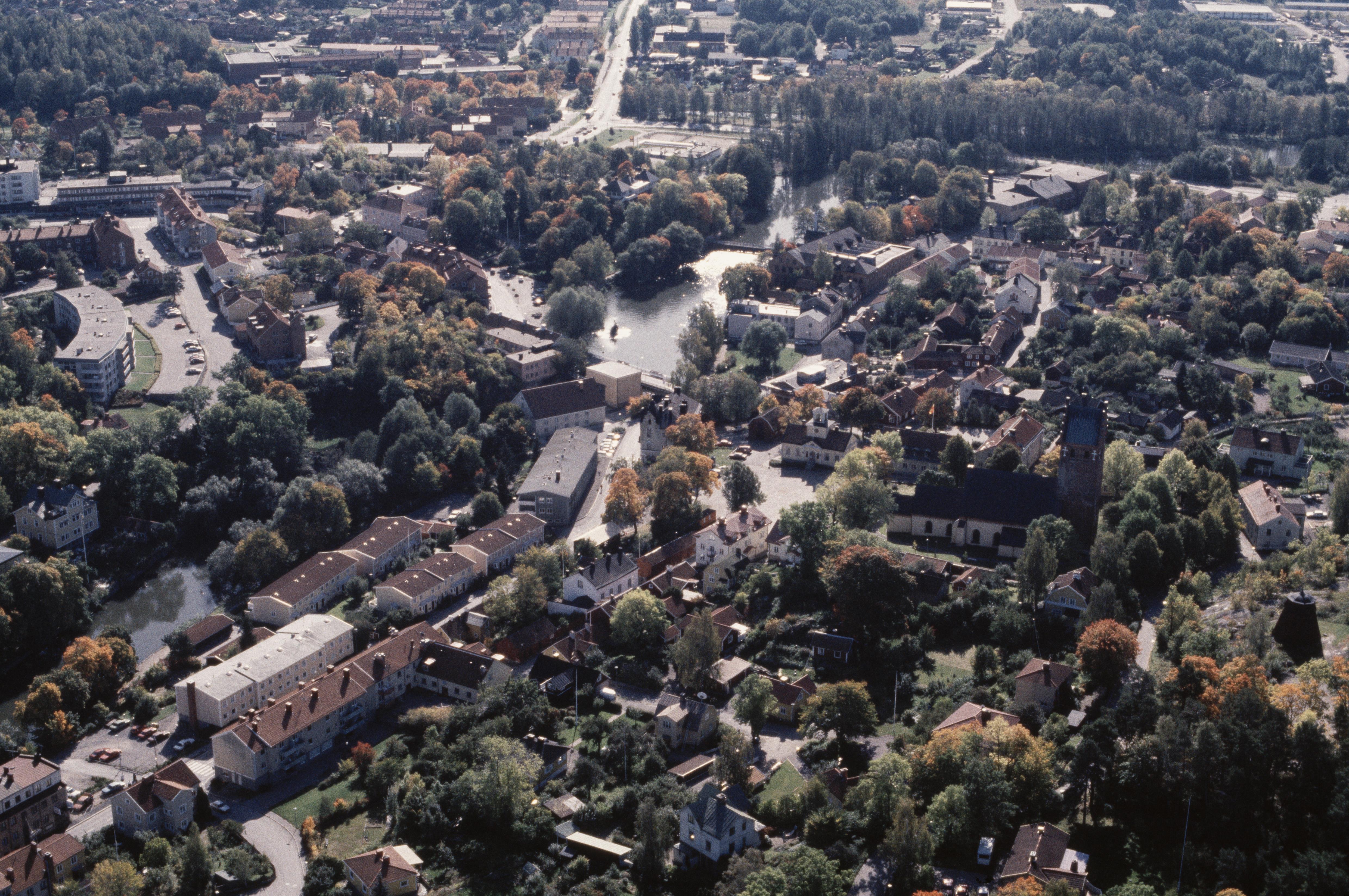Beskrivning: Torshälla tätort. Eskilstunaån. Borgruin RAÄnr Torshälla 71:1 till vänster om bildens mitt. I bildens högra del stadslager RAÄnr Torshälla 95:1 och Torshälla kyrka. Bilden är tagen mot (väderstreck): S