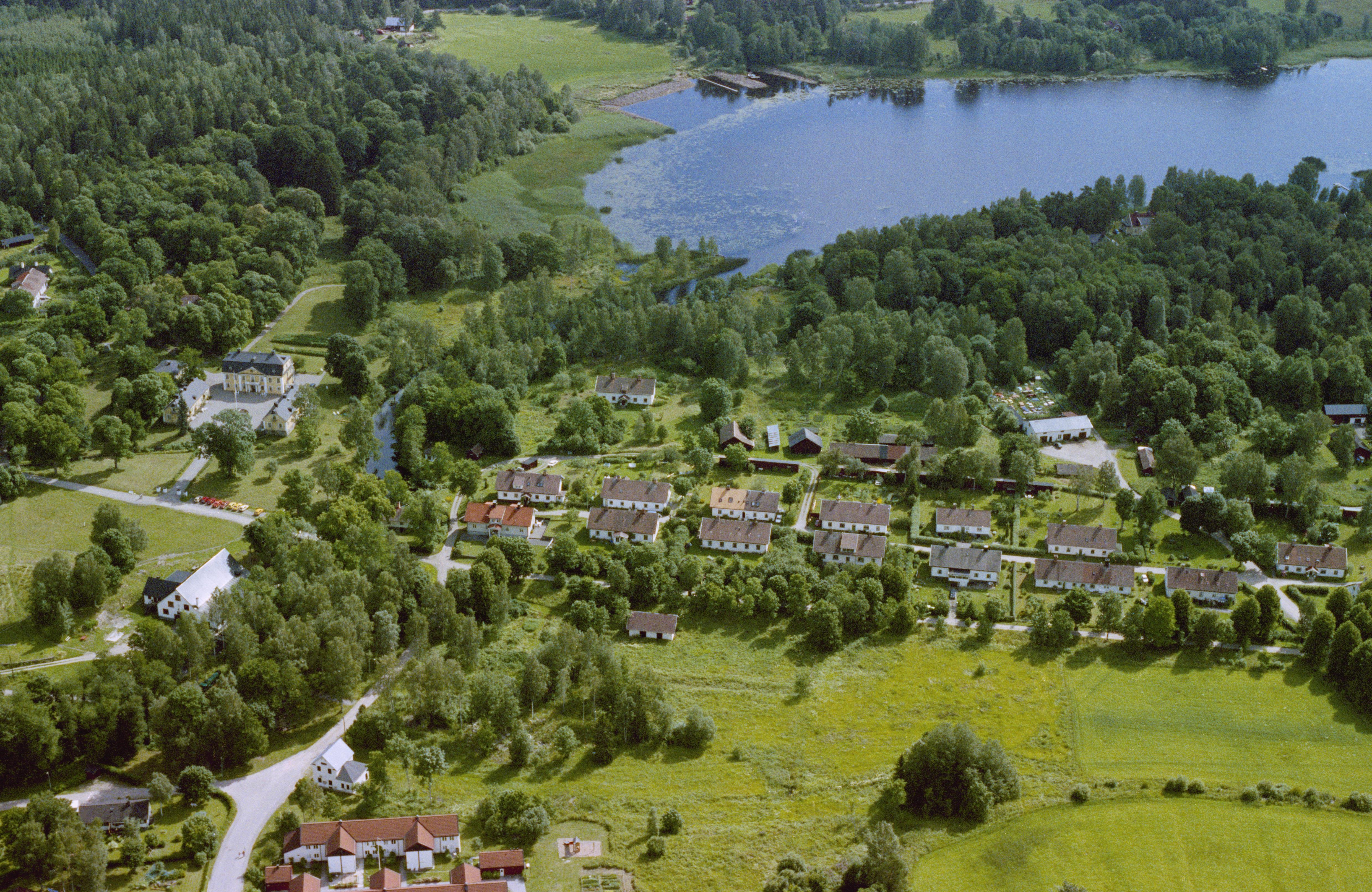 Beskrivning: Skebobruk RAÄnr Ununge 127:1 vid Skeboån och sjön Närdingen. Till vänster om bildens mitt Skebobruks herrgård. Bilden är tagen mot (väderstreck): ONO