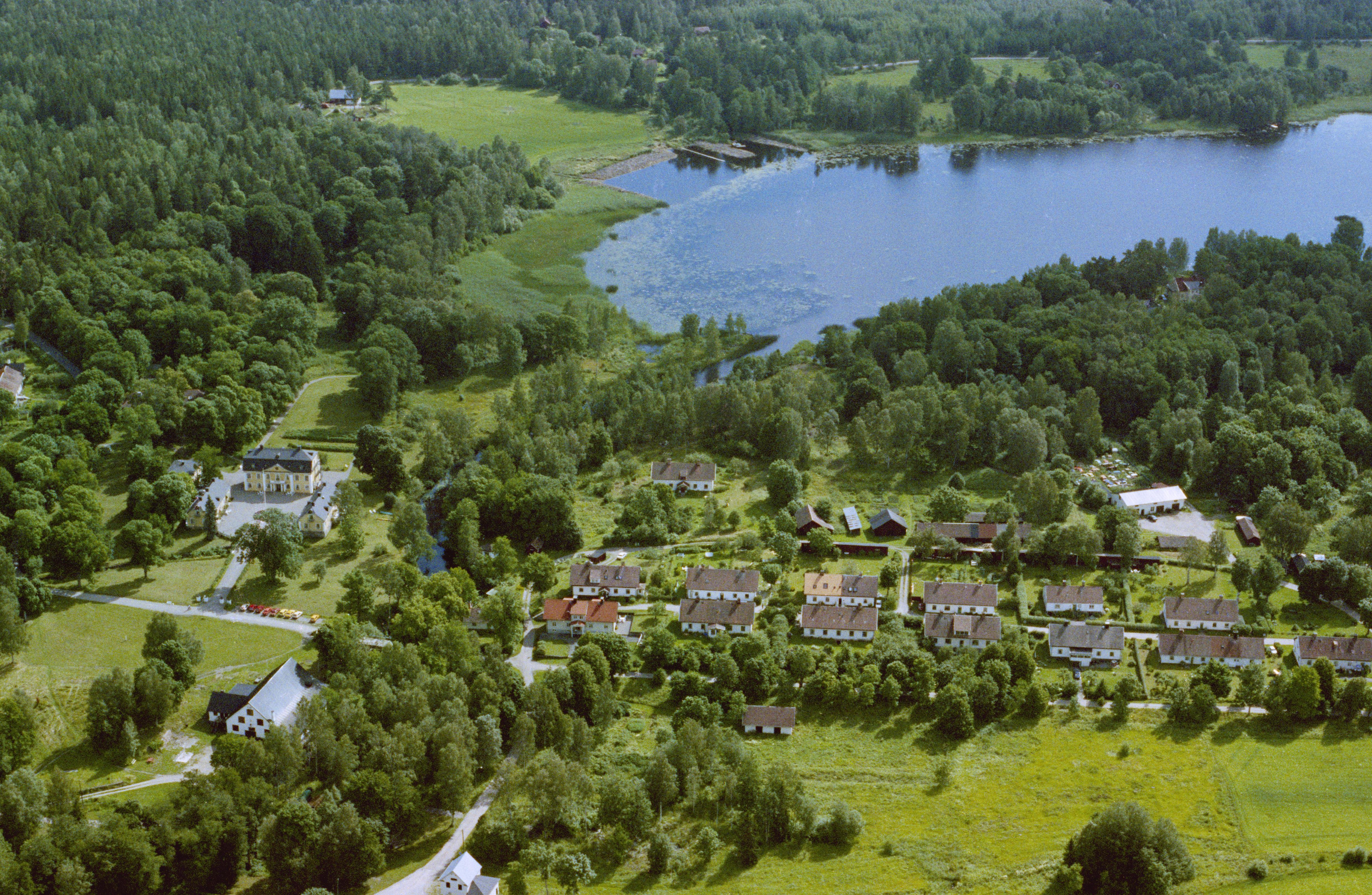 Beskrivning: Skebobruk RAÄnr Ununge 127:1 vid Skeboån och sjön Närdingen. Till vänster om bildens mitt Skebobruks herrgård. Bilden är tagen mot (väderstreck): ONO