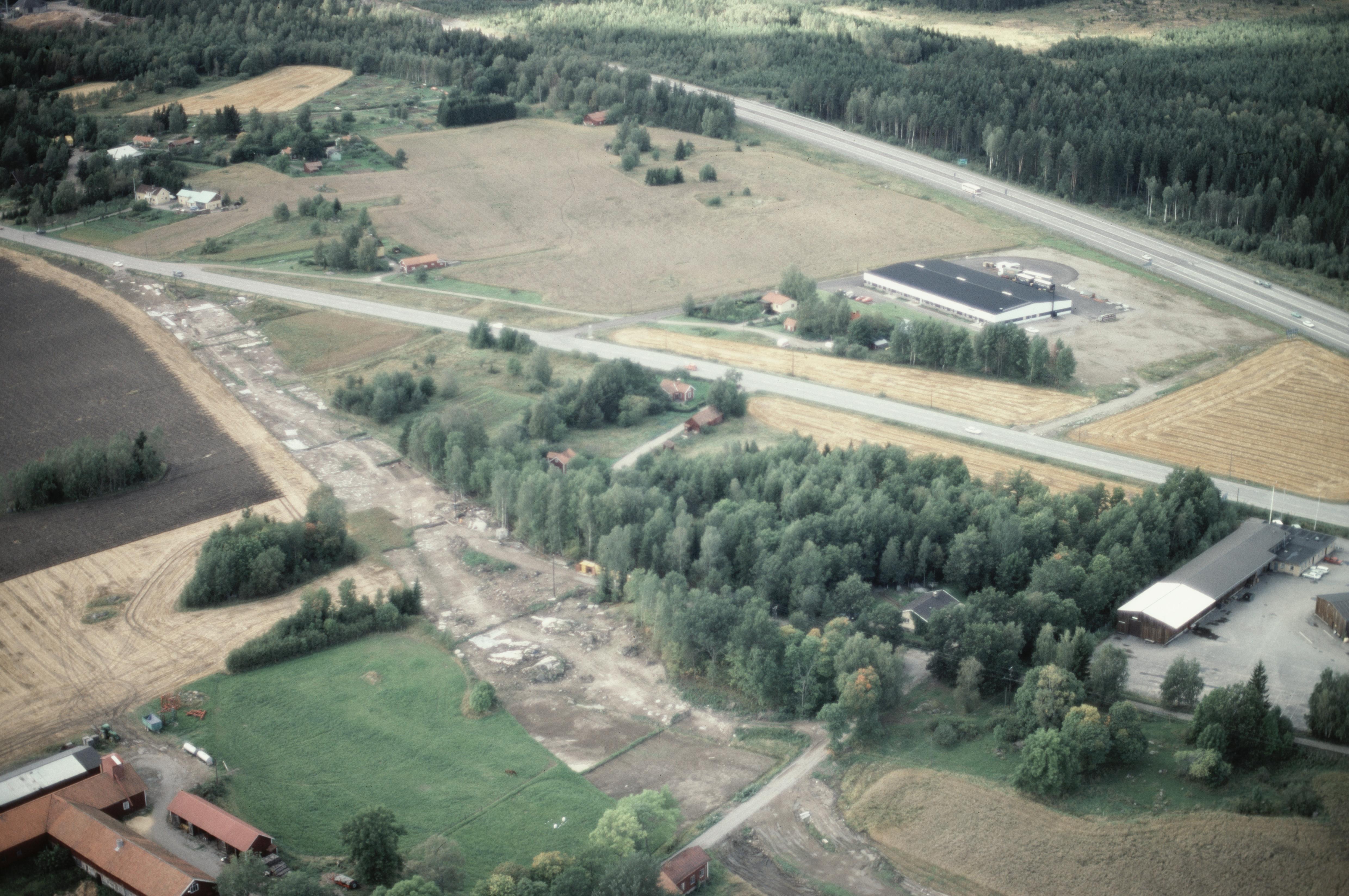 Beskrivning: Arkeologisk undersökning innan vägbygge av E18 norrväst i Enköpings stad. Vid bildens mitt fornlämningsomådet Annelund RAÄnr Enköping 16:1, Enköping 17:1 m.fl. Bilden är tagen mot (väderstreck): VNV