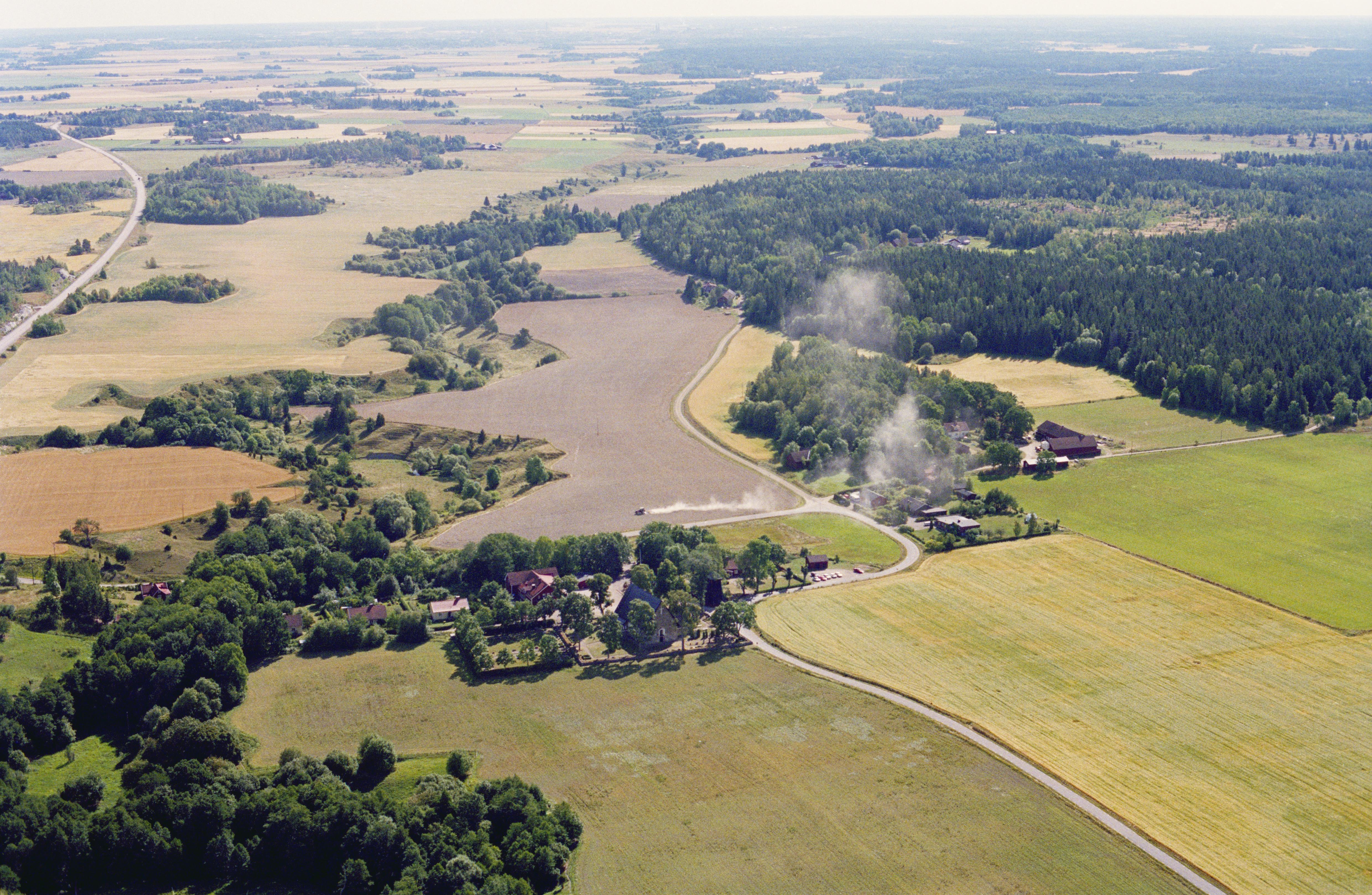 Beskrivning: Jumkils kyrka vid Jumkilsån. I bildens övre del socknen Åkerby och Börje. Bilden är tagen mot (väderstreck): SO