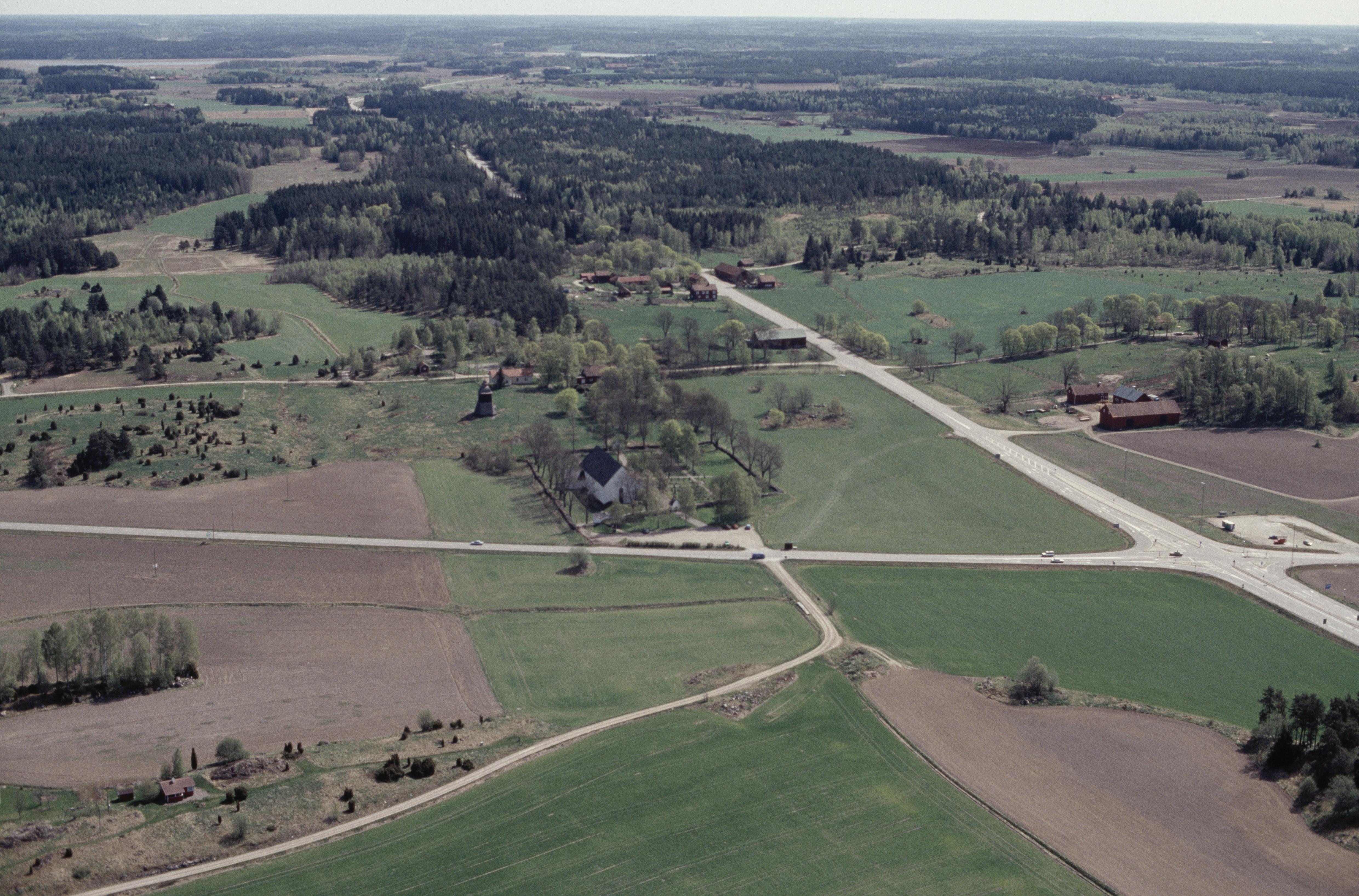 Beskrivning: Litslena kyrka vid gamla väg E18. Nere till vänster fornlämningsområdet Blomsterbacken med hällristningar och högar, bl.a. RAÄnr Litslena 149:1-2, 423:1-3, Bilden är tagen mot (väderstreck): Ö