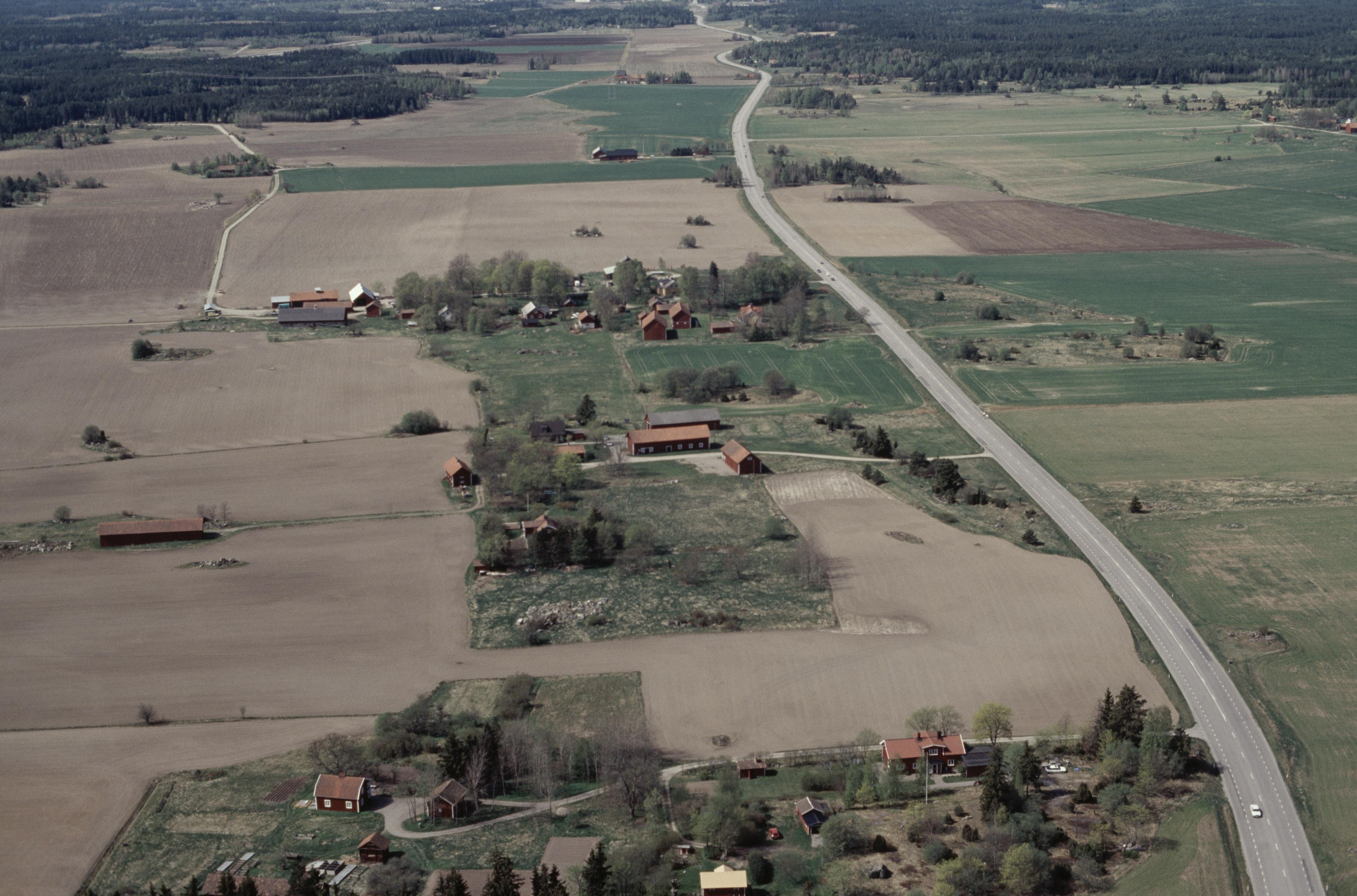 Beskrivning: Östra Vällinge by i bildens nedre del. Vid bildens mitt Västra Vällinge by med bl.a. hällristning RAÄnr Litslena 430:1. Till höger gamla väg E18 mot Enköping. Bilden är tagen mot (väderstreck): VSV