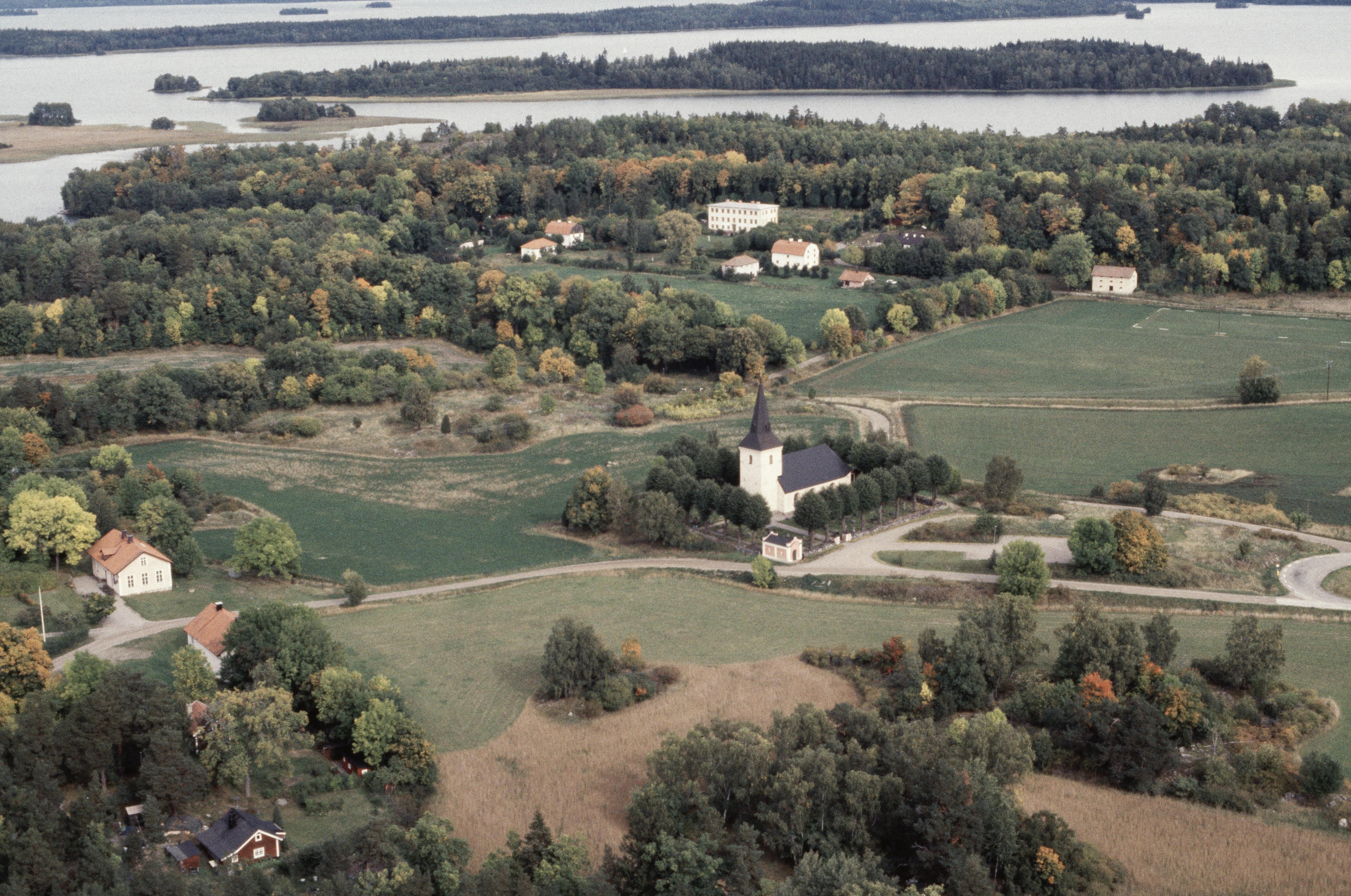 Beskrivning: Till vänster om bildens mitt Överenhörna hembygdsgård. Överenhörna kyrka vid bildens mitt. Över bildens mitt bytomt Husby backe RAÄnr Överenhörna 61:1-4. I bildens övre del Ekensbergs herrgård vid Hornboviken i Mälaren. Bilden är tagen mot (väderstreck): NO
