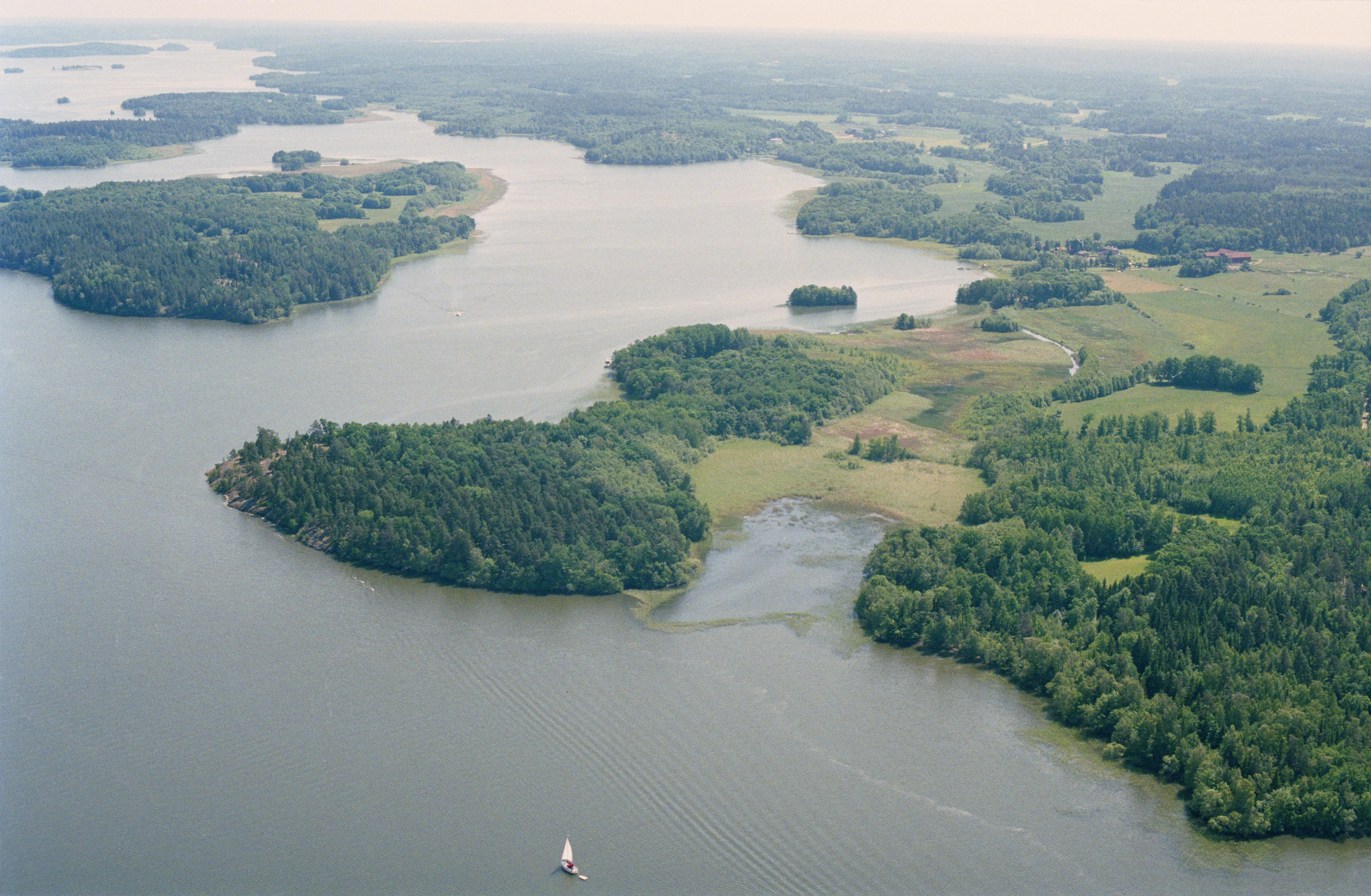 Beskrivning: Hornboviken i Mälaren. Under bildens mitt Eksholmen med stensättning RAÄnr Överenhörna 9:1. Uppe till höger Horns herrgård. Bilden är tagen mot (väderstreck): SO