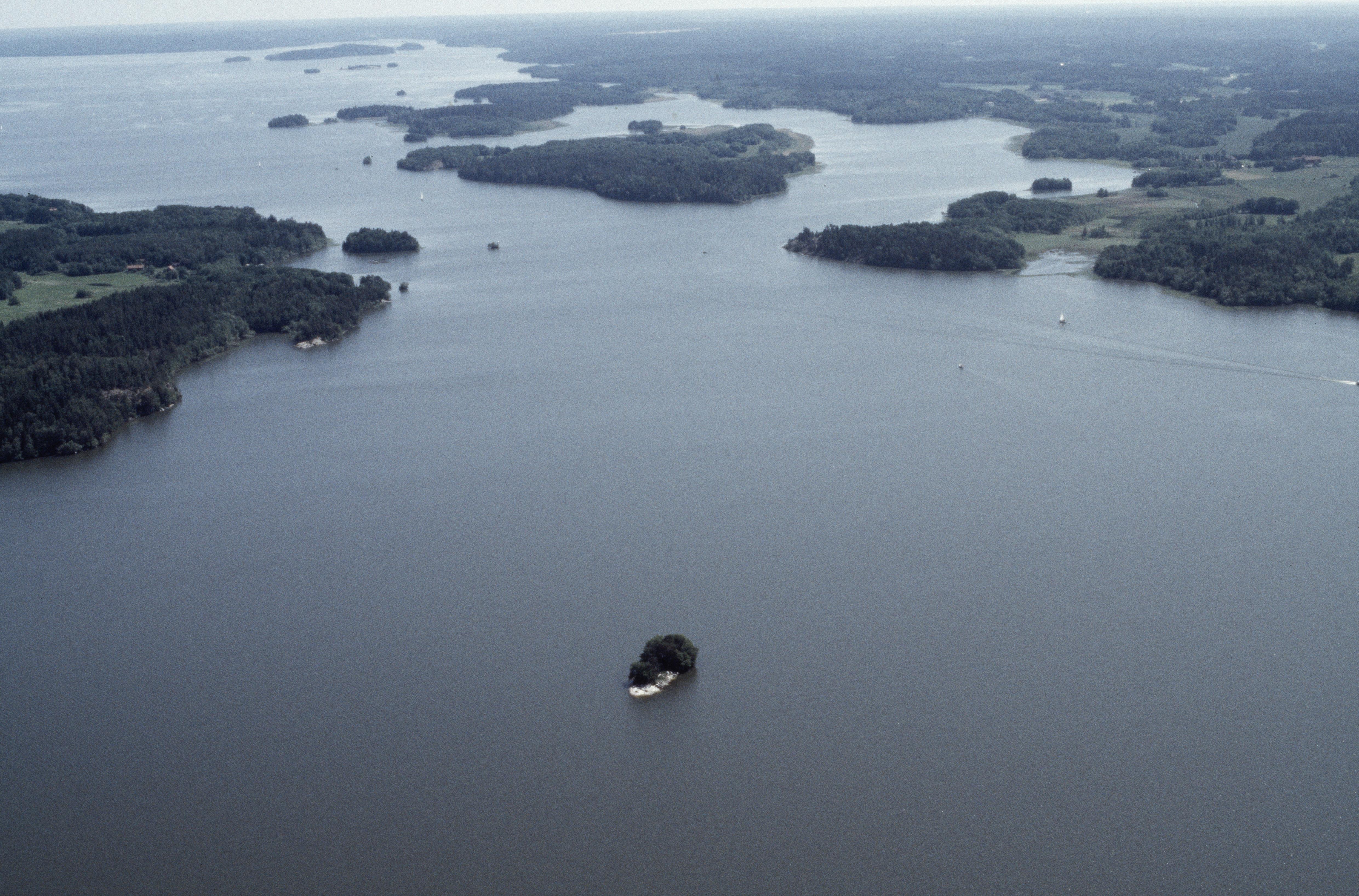 Beskrivning: Mälaren. I bildens nedre del holmen Munken i farleden mot Överenhörna. Till höger över bildens mitt Eksholmen i Hornboviken med stensättning RAÄnr Överenhörna 9:1. Uppe till höger Horns herrgård. Bilden är tagen mot (väderstreck): SO