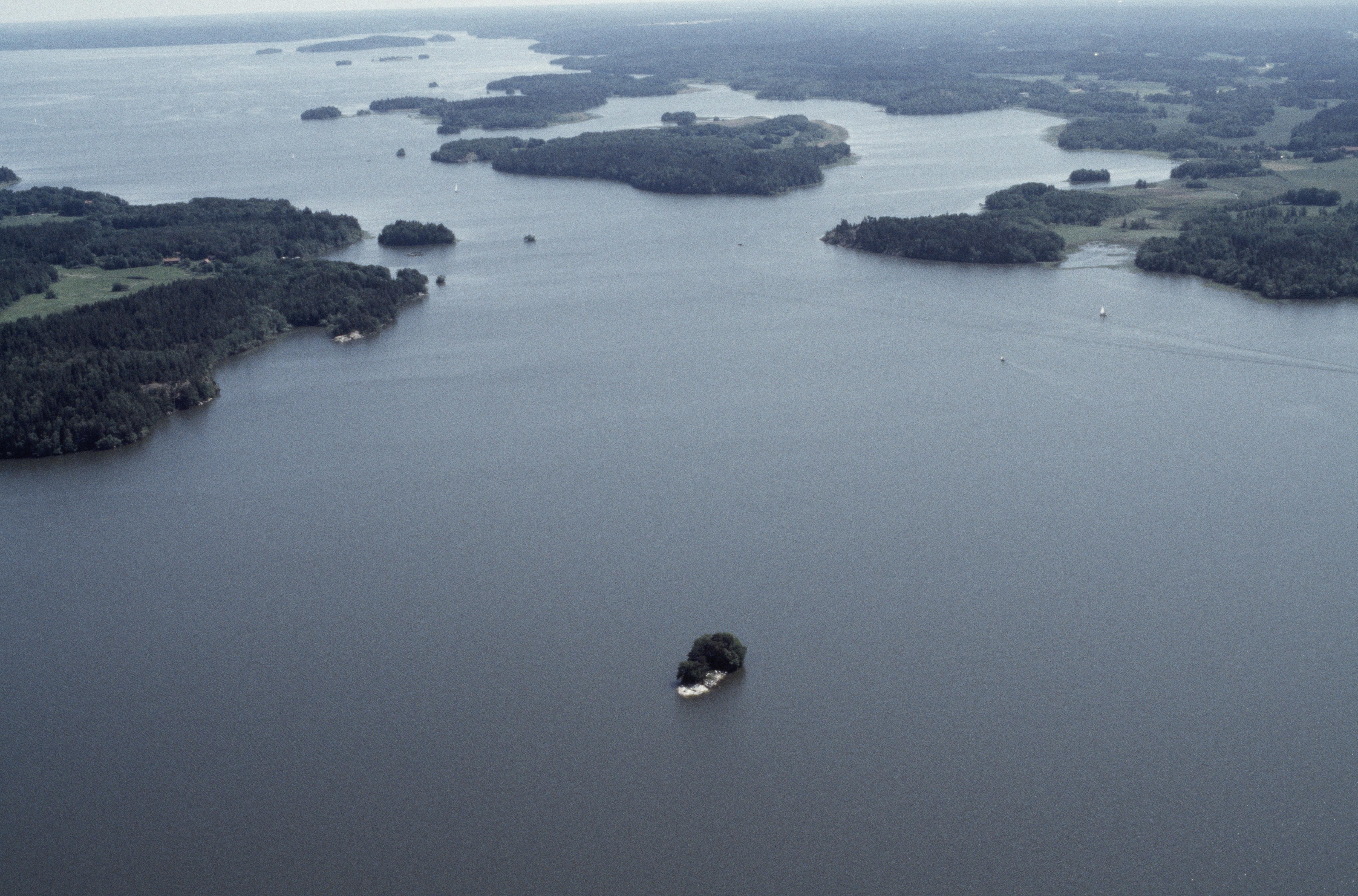 Beskrivning: Mälaren. I bildens nedre del holmen Munken i farleden mot Överenhörna. Till höger över bildens mitt Eksholmen i Hornboviken med stensättning RAÄnr Överenhörna 9:1. Uppe till höger Horns herrgård. Bilden är tagen mot (väderstreck): SO