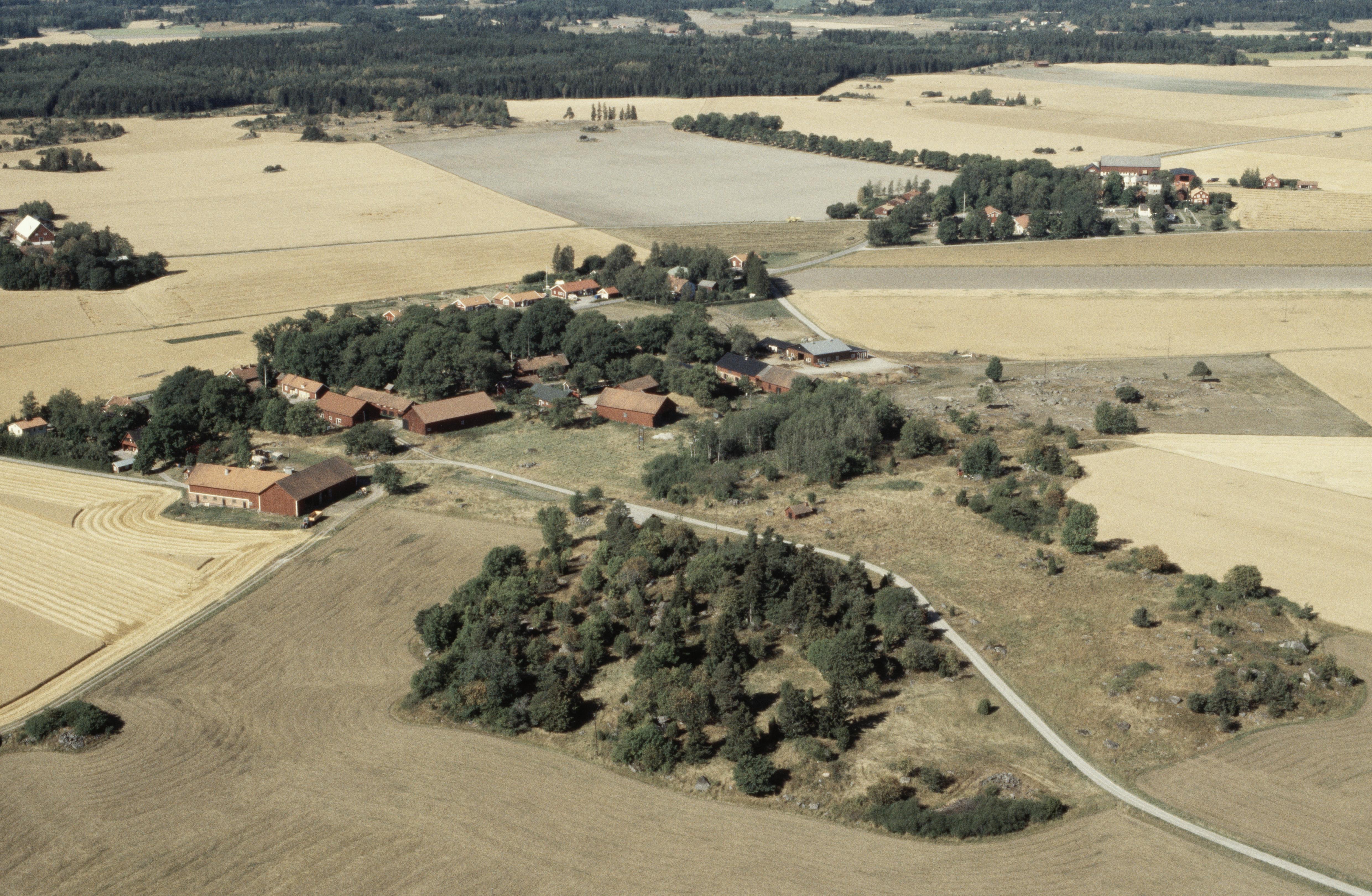 Beskrivning: Balingstaby. Under bildens mitt gravfält RAÄ Balingsta 11:1. Balingsta kyrka och kyrkby uppe till höger. Bilden är tagen mot (väderstreck): VSV