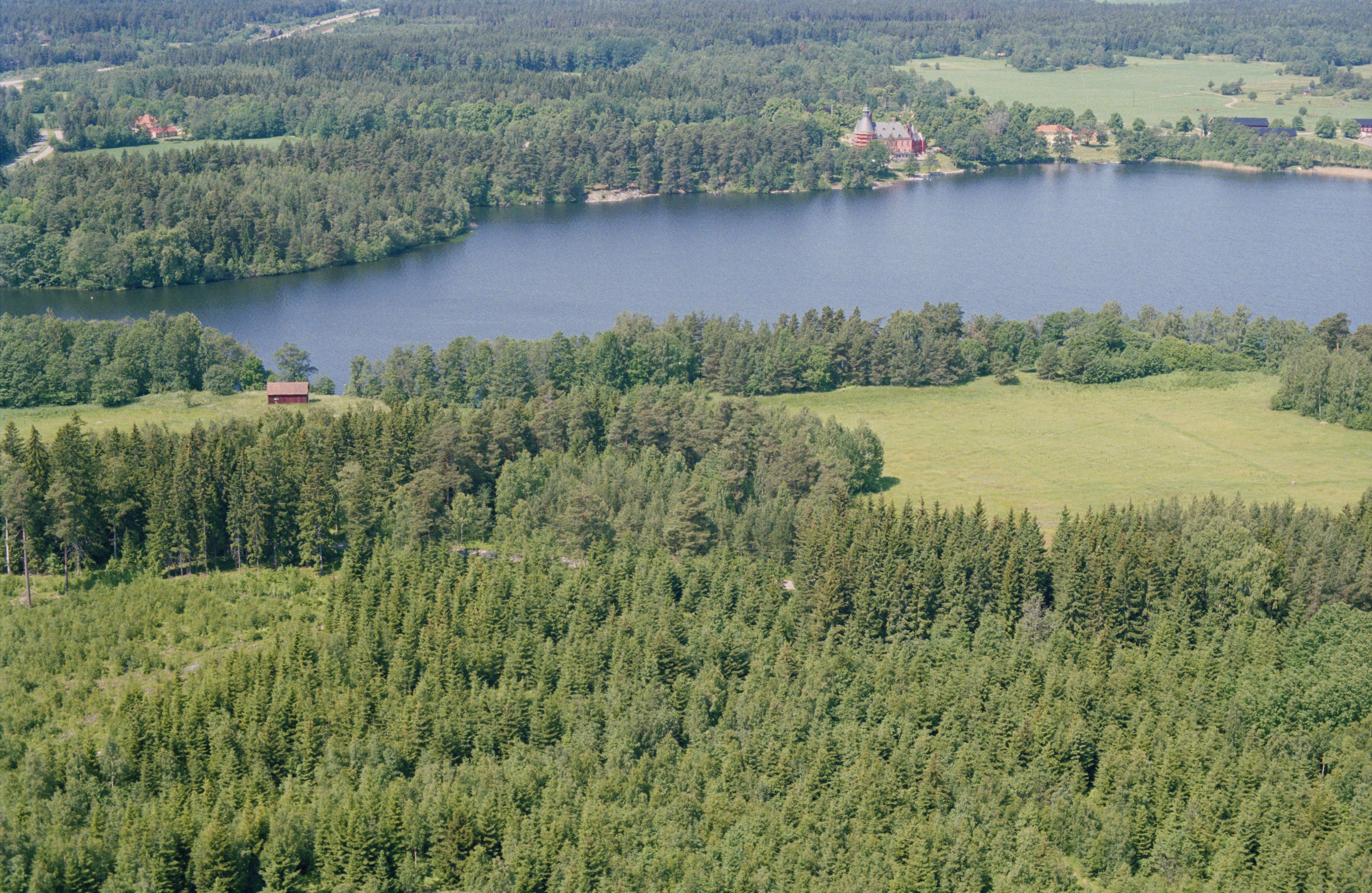 Beskrivning: Torpet Stora Tingsviken vid Lejondalssjön vid Stora Tingsviken. Vid bildens mitt stensättning RAÄnr Bro 129:1. Lejondals slott uppe till höger. Bilden är tagen mot (väderstreck): V
